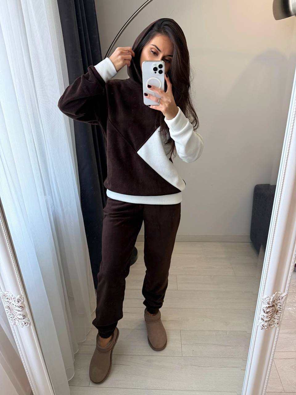Худі з капюшоном і м’якими манжетами, штани на резинці знизу — комфортна посадка та зручність у русі.