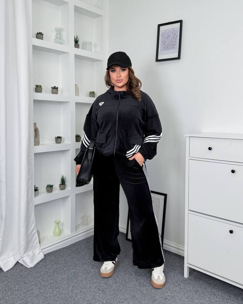 Дуже теплий і приємний на дотик велюровий костюм. Лампаси ідеально доповнюють костюм і роблять його цікавим і стильним. Кофта на молнії, спереду дві кишені, низ затягується на шляпну резинку, є капюшон. Штани на резинці з кишенями з боків.