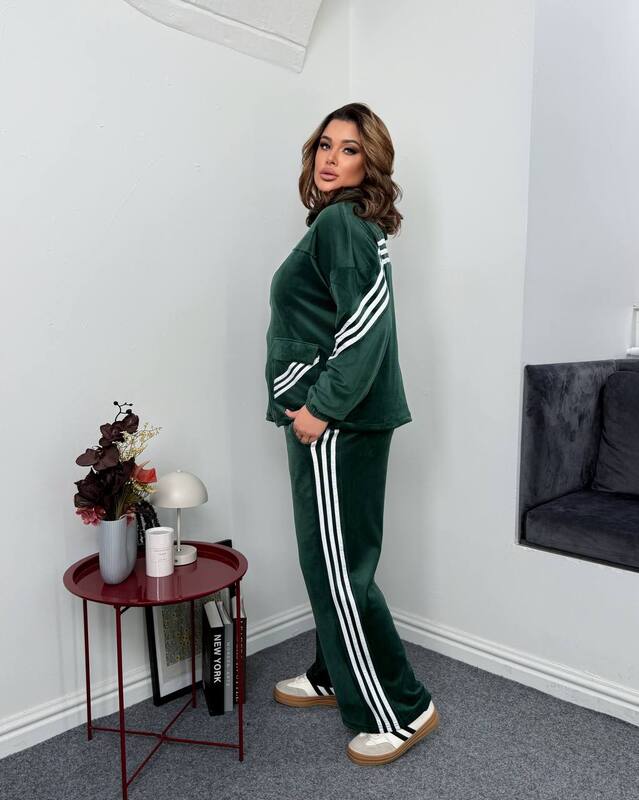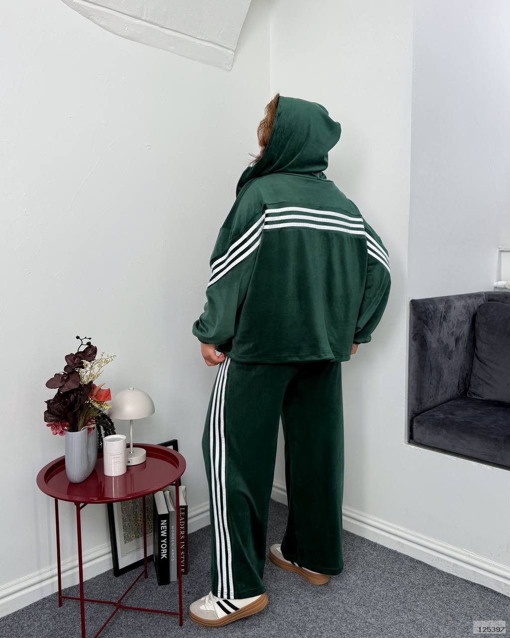 Дуже теплий і приємний на дотик велюровий костюм. Лампаси ідеально доповнюють костюм і роблять його цікавим і стильним. Кофта на молнії, спереду дві кишені, низ затягується на шляпну резинку, є капюшон. Штани на резинці з кишенями з боків.