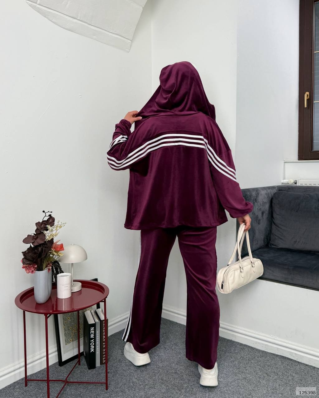 Дуже теплий і приємний на дотик велюровий костюм. Лампаси ідеально доповнюють костюм і роблять його цікавим і стильним. Кофта на молнії, спереду дві кишені, низ затягується на шляпну резинку, є капюшон. Штани на резинці з кишенями з боків.