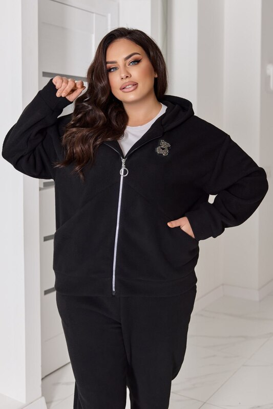 Теплий костюм з якісного флісу полар: штани зі зручними кишенями середньої посадки на резинці, кофта на блискавці по всій довжині з прорізними кишенями. Декор на кофті — трендовий «ведмедик», що додає образу акцент.
