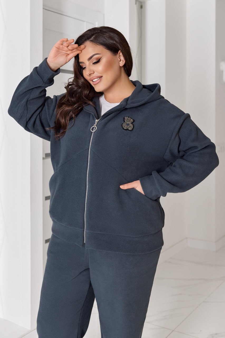Теплий костюм з якісного флісу полар: штани зі зручними кишенями середньої посадки на резинці, кофта на блискавці по всій довжині з прорізними кишенями. Декор на кофті — трендовий «ведмедик», що додає образу акцент.
