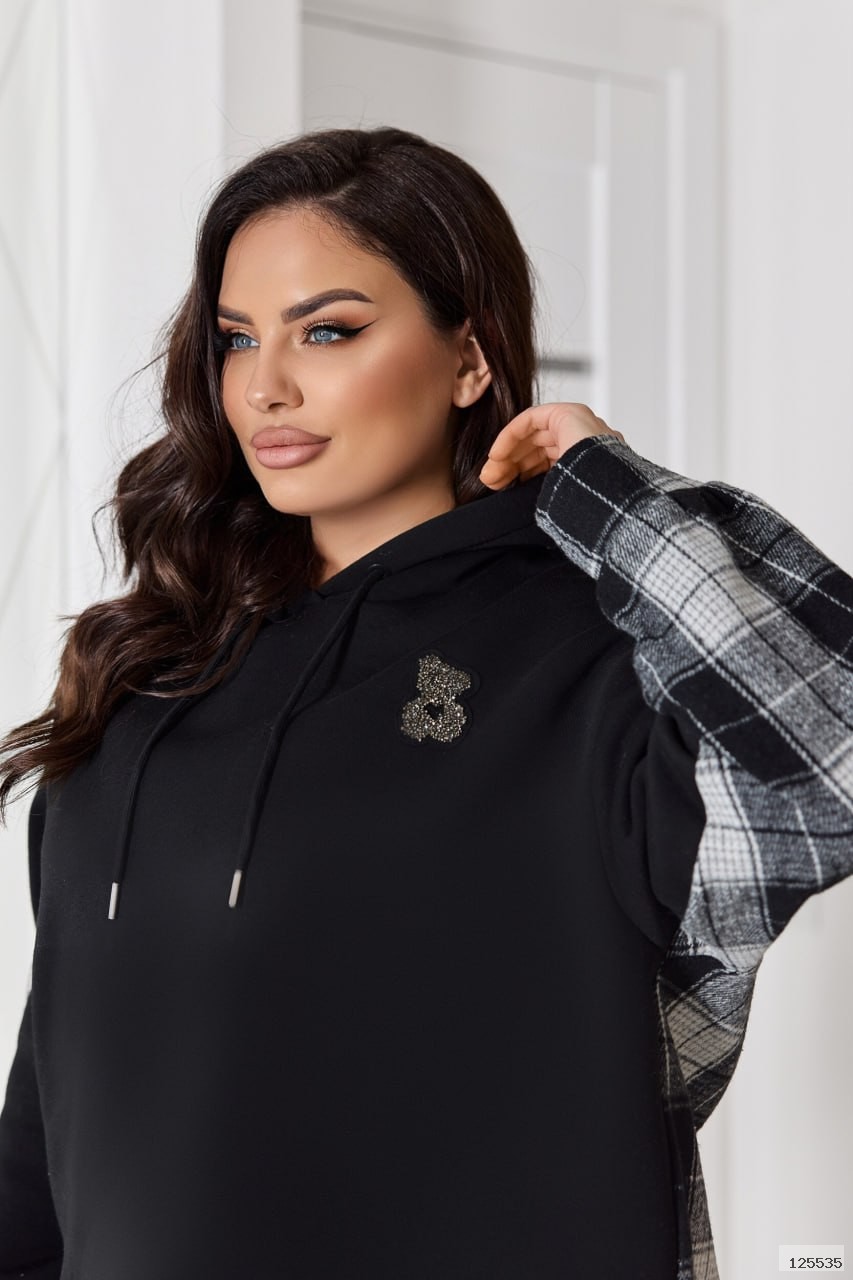 Комбінований теплий костюм із тринитки на флісі та байки в клітинку: штани середньої посадки на резинці з кишенями й оверсайз худі з капюшоном, розрізами з боків та трендовим декором «ведмедик». Ідеальний для затишних прогулянок та активних днів!