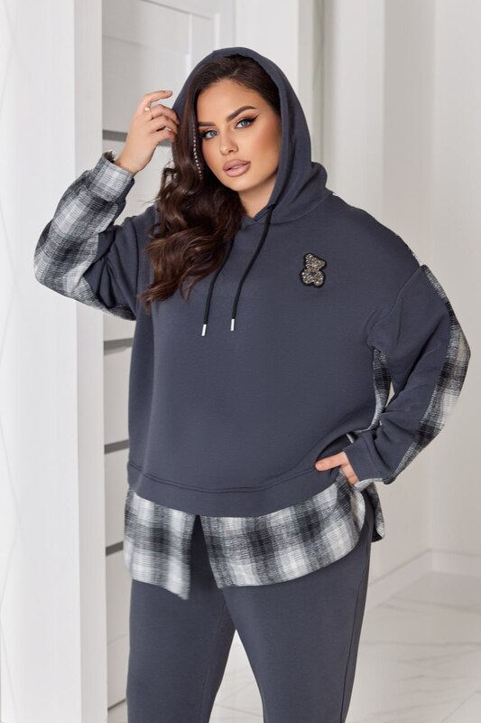 Комбінований теплий костюм із тринитки на флісі та байки в клітинку: штани середньої посадки на резинці з кишенями й оверсайз худі з капюшоном, розрізами з боків та трендовим декором «ведмедик». Ідеальний для затишних прогулянок та активних днів!