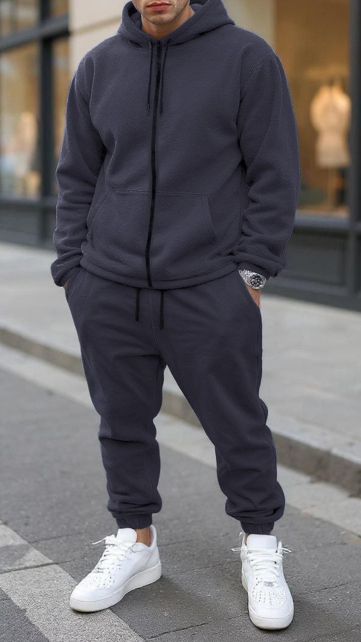 Кофта на блискавці з капюшоном і накладними кишенями.Штани з манжетами на резинці,бічними кишенями та шнурком для регулювання талії.