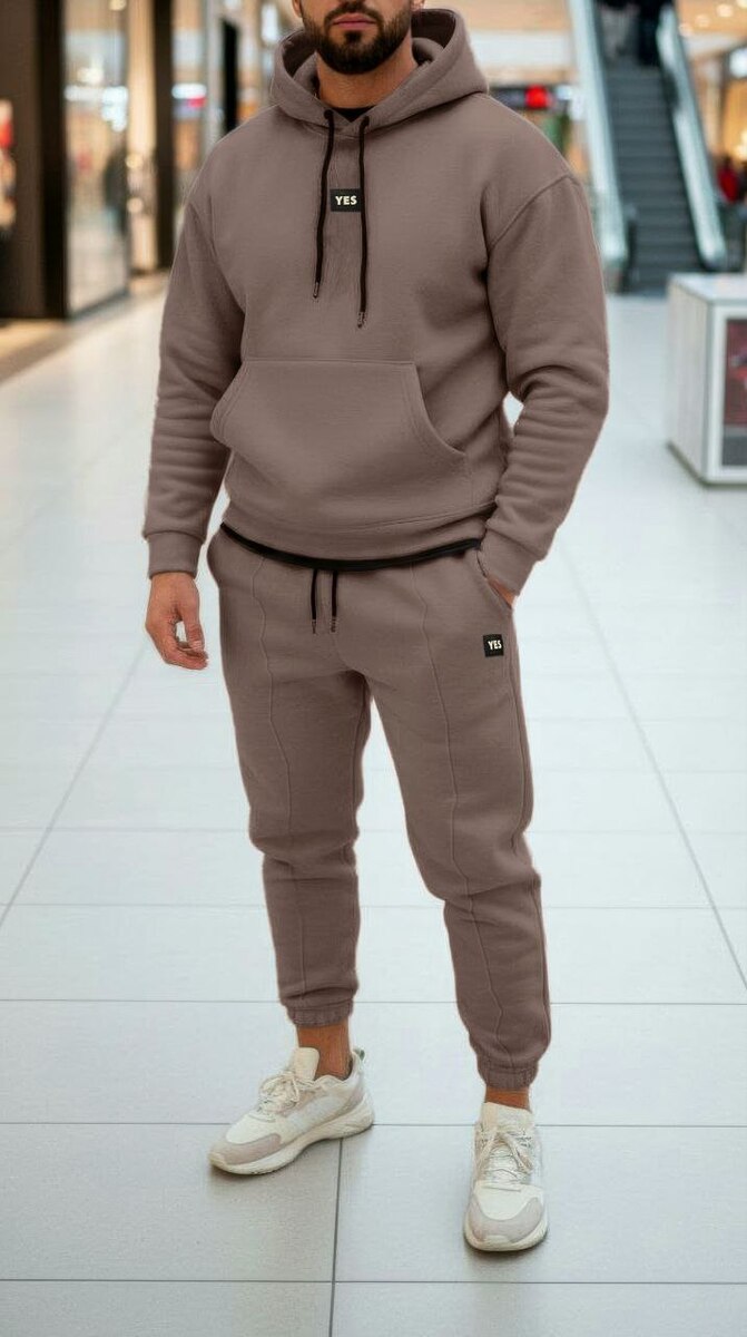 Худі з капюшоном і накладною кишенею.Штани з бічними кишенями,еластичним поясом і резинкою внизу.Костюм доповнений стильними нашивками.