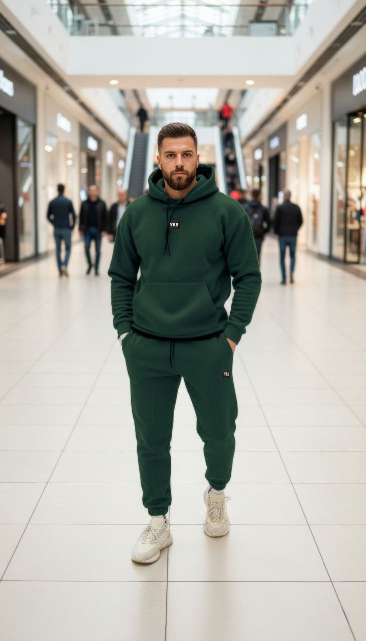Худі з капюшоном і накладною кишенею.Штани з бічними кишенями,еластичним поясом і резинкою внизу.Костюм доповнений стильними нашивками.
