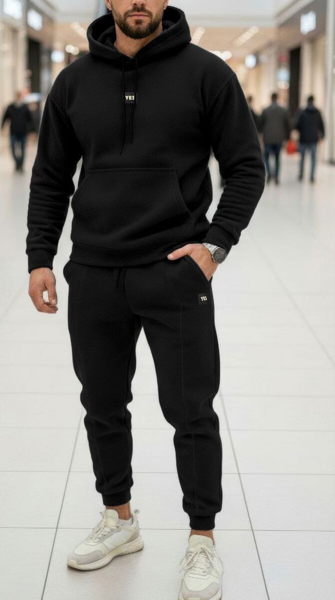 Худі з капюшоном і накладною кишенею.Штани з бічними кишенями,еластичним поясом і резинкою внизу.Костюм доповнений стильними нашивками.