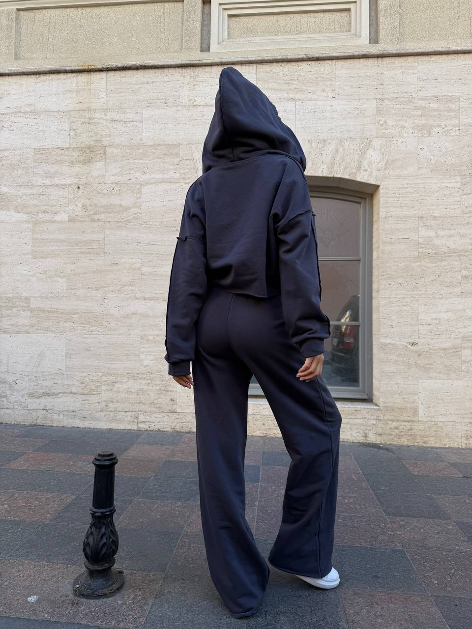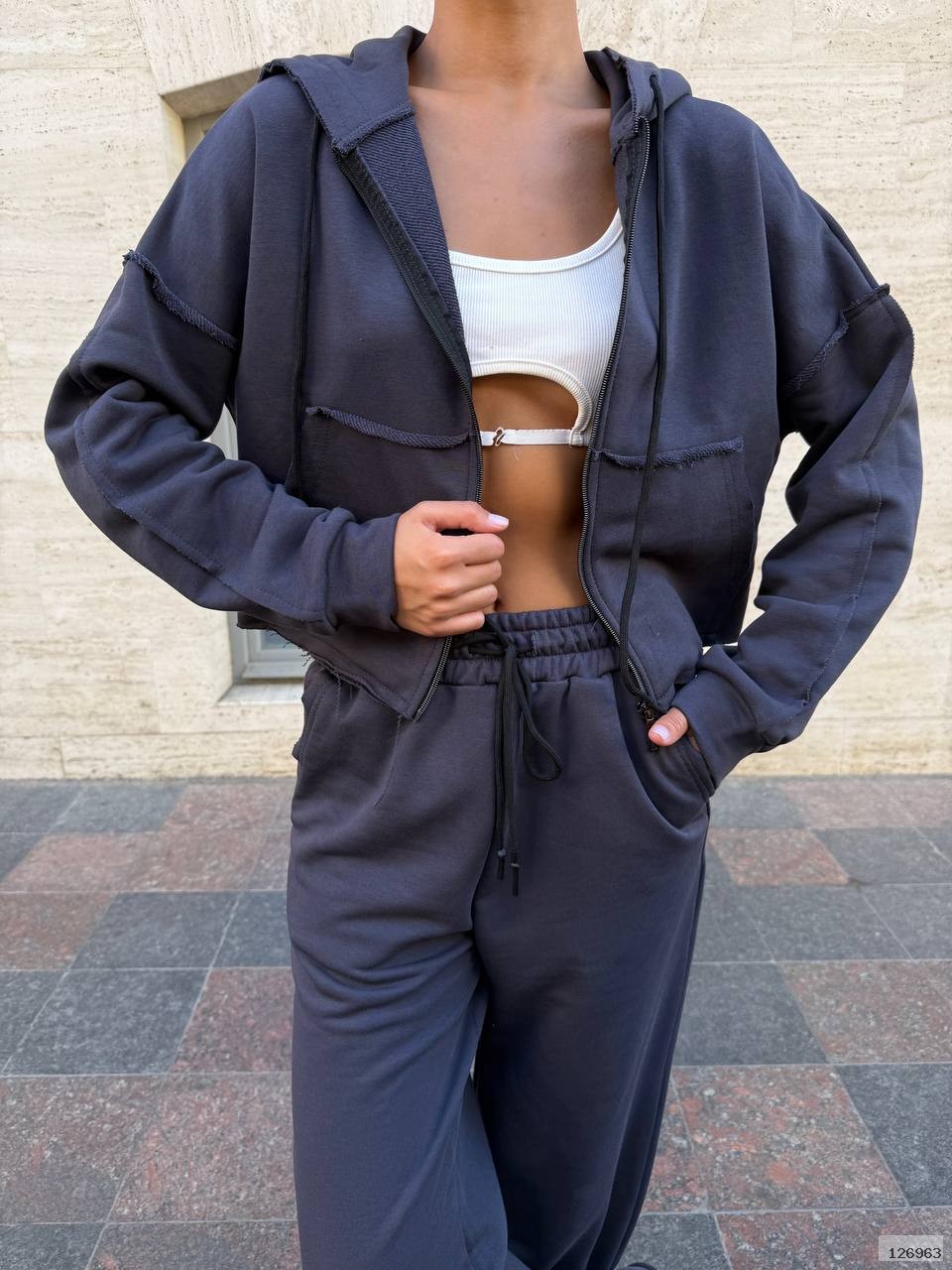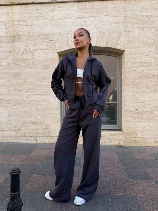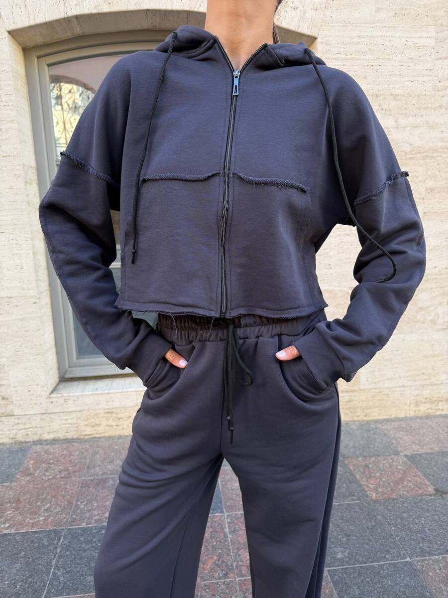 Костюм, який говорить замість тебе. Зовнішні шви, необроблені краї, кроп-топ на блискавці — кожна деталь створена, щоб виділятись.