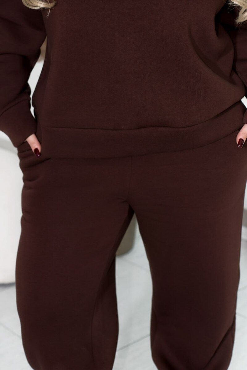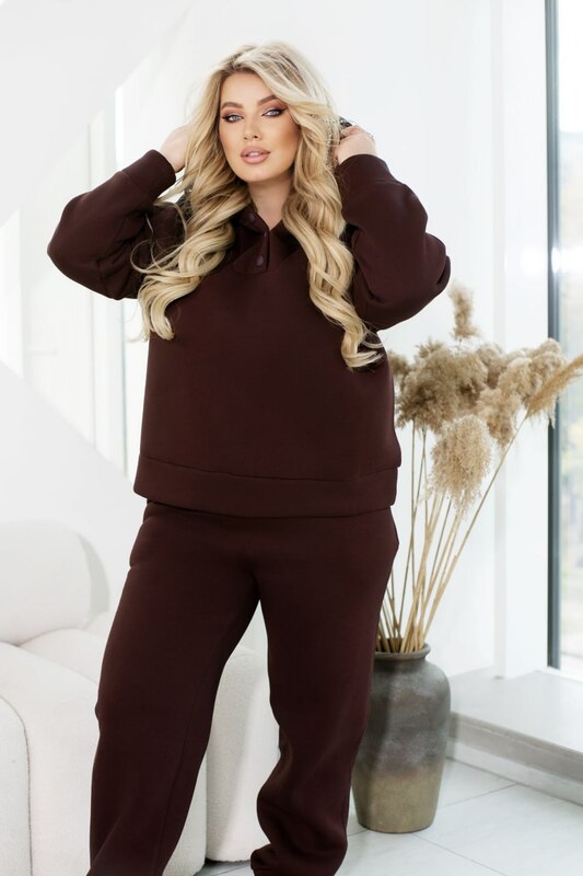 Теплий спортивний костюм із трьохнитки на флісі, який не кошлатиться, створений для максимального комфорту та затишку. Худі із капюшоном має дві кнопки на горловині, що надійно захищають від холоду та забезпечують додаткове тепло, прикриваючи шию. Довгі рукави з манжетами гарантують комфортну посадку та зберігають тепло. Штани з високою посадкою на гумці чудово підкреслюють талію, а манжети внизу забезпечують зручність та стиль. Модель також оснащена практичними боковими кишенями, які додають функціональності. Ідеальний варіант для прохолодної погоди та активного відпочинку.
