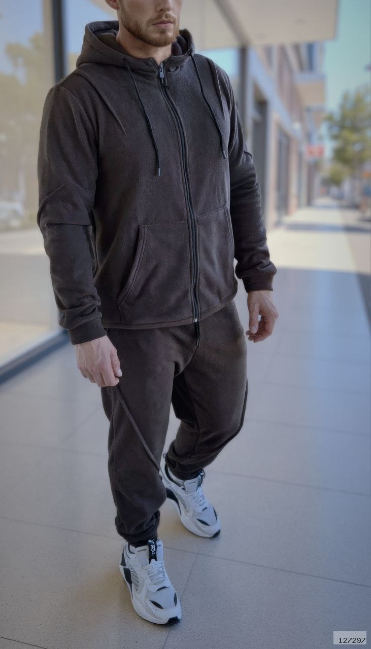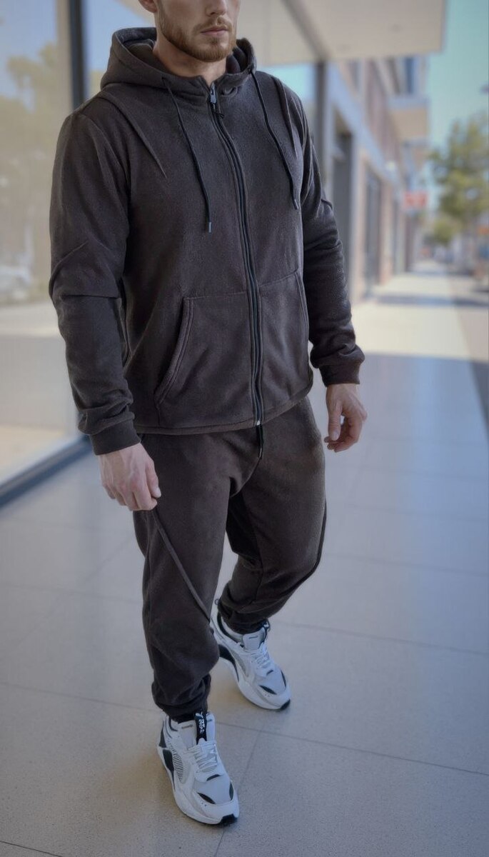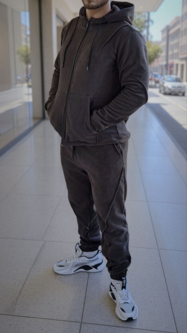 Кофта на блискавці з капюшоном і накладними кишенями,доповнене декоративними швами.Штани з манжетами на резинці,бічними кишенями,декоративними швами та шнурком для регулювання талії.