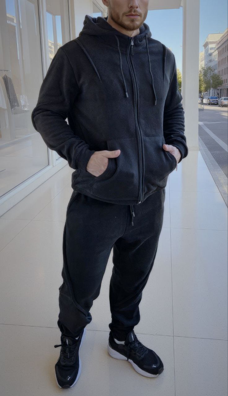 Кофта на блискавці з капюшоном і накладними кишенями,доповнене декоративними швами.Штани з манжетами на резинці,бічними кишенями,декоративними швами та шнурком для регулювання талії.