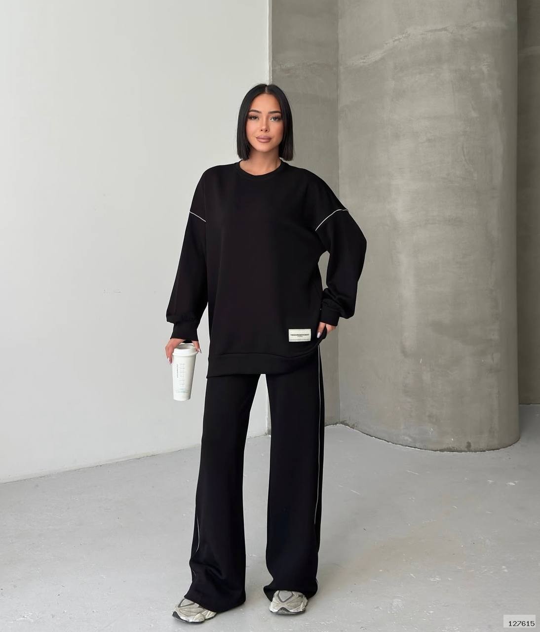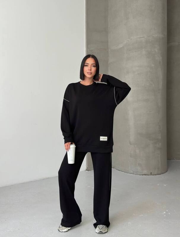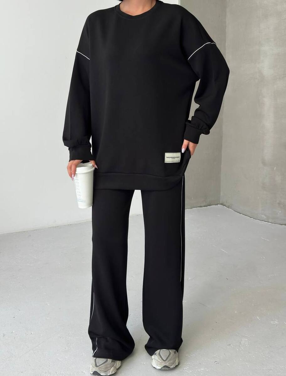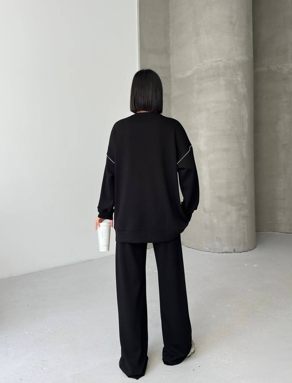 Костюм декорований нашивкою та кантом. Штани мають високу посадку, пояс на резинці