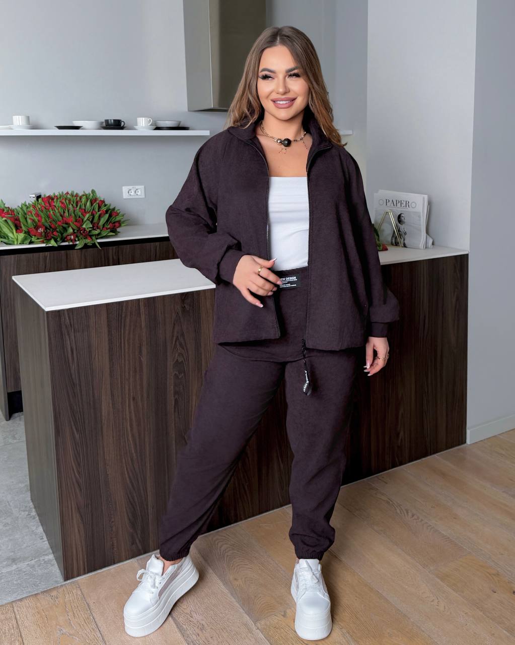 Спортивний костюм опис: кофта на змійці з кішкнями, по низу фіксатор з утяжкою + джогери з середньою посадкою, з кішенями.