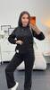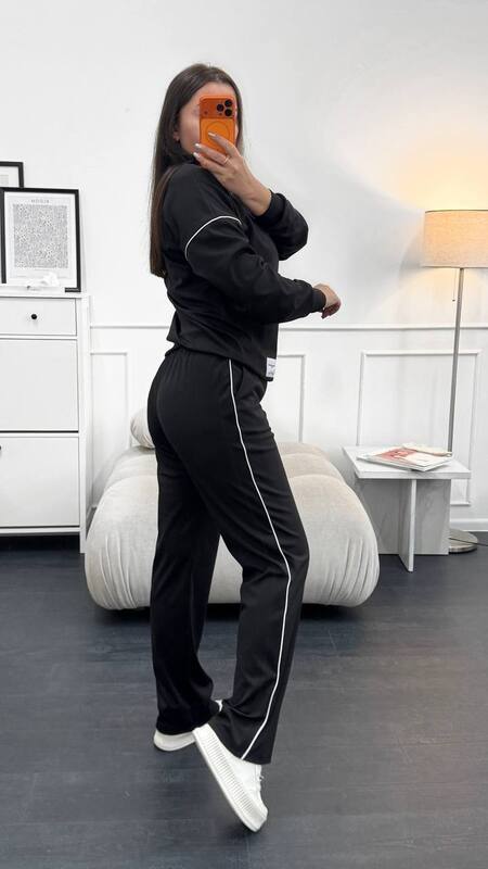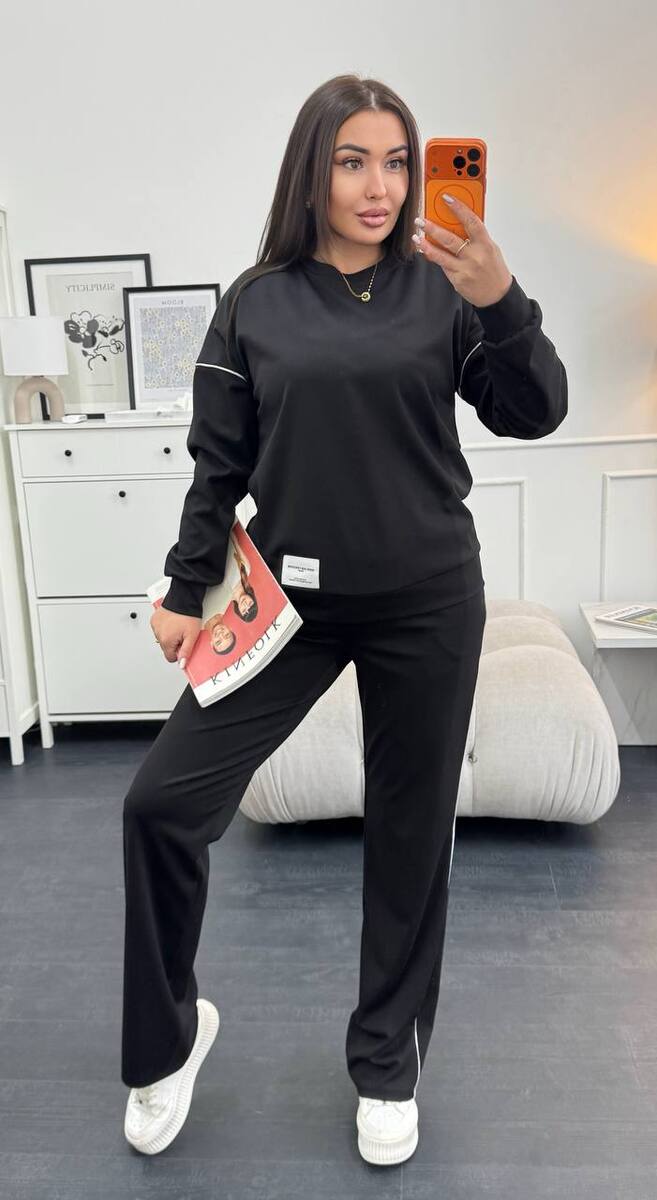 Тканина має гарну розтяжність, не скочується, не втрачає колір при пранні. Костюм декорований нашивкою та кантом. Штани мають високу посадку, пояс на резинці