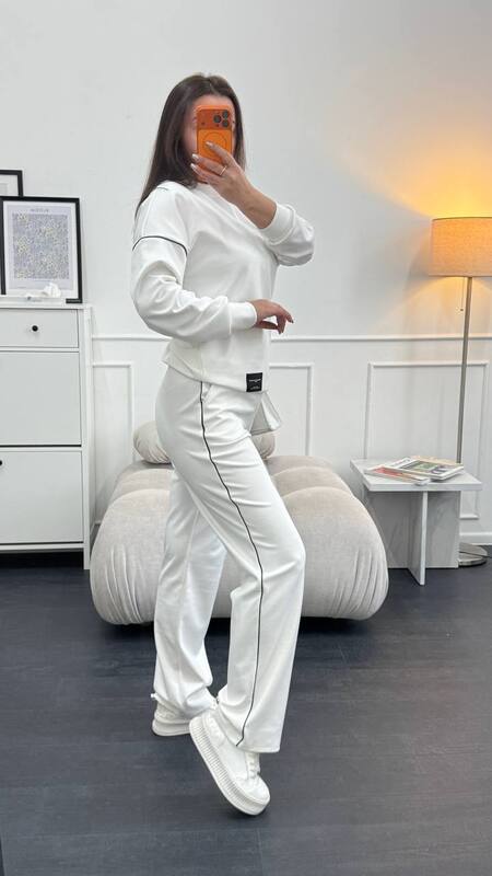 Тканина має гарну розтяжність, не скочується, не втрачає колір при пранні. Костюм декорований нашивкою та кантом. Штани мають високу посадку, пояс на резинці