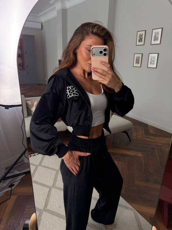 Кофта на блискавці з акуратною вишивкою додає образу преміальності, а вільні штани забезпечують максимальну зручність.