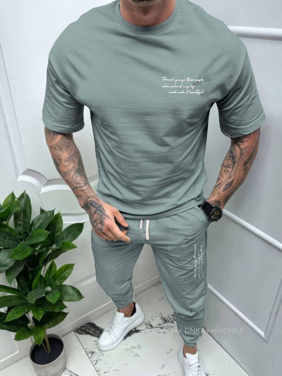Футболка з принтом на грудях,штани з еластичним поясом зі шнурком,бічними кишенями,принтом та манжетами на резинці.