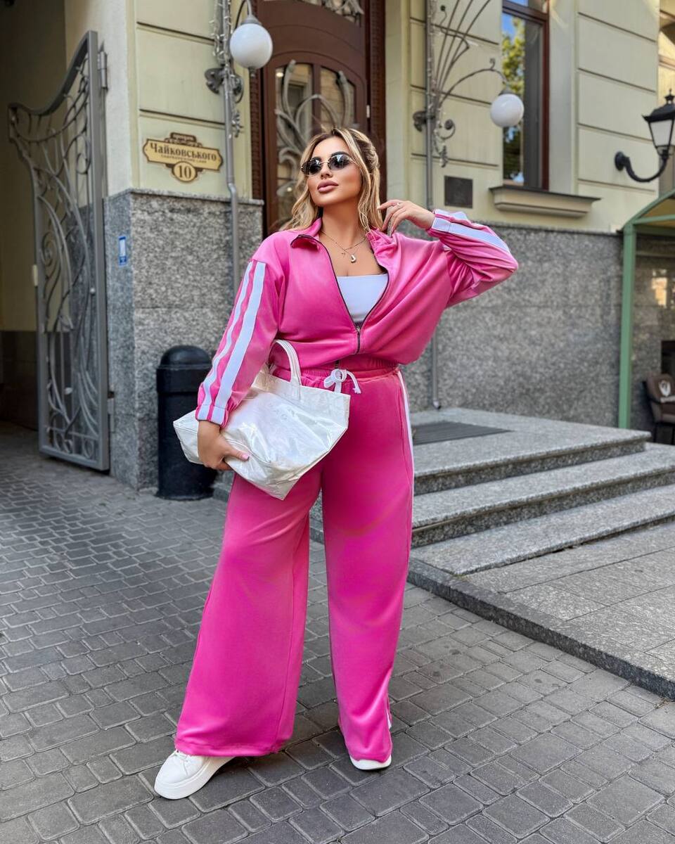 Кофта на блискавці, штанці палаццо висока посадка, пояс на резинці з робочим шнурком в поясі. Лампаси м,які х/б, тканину не стягують, дуже зручний, практичний костюм.