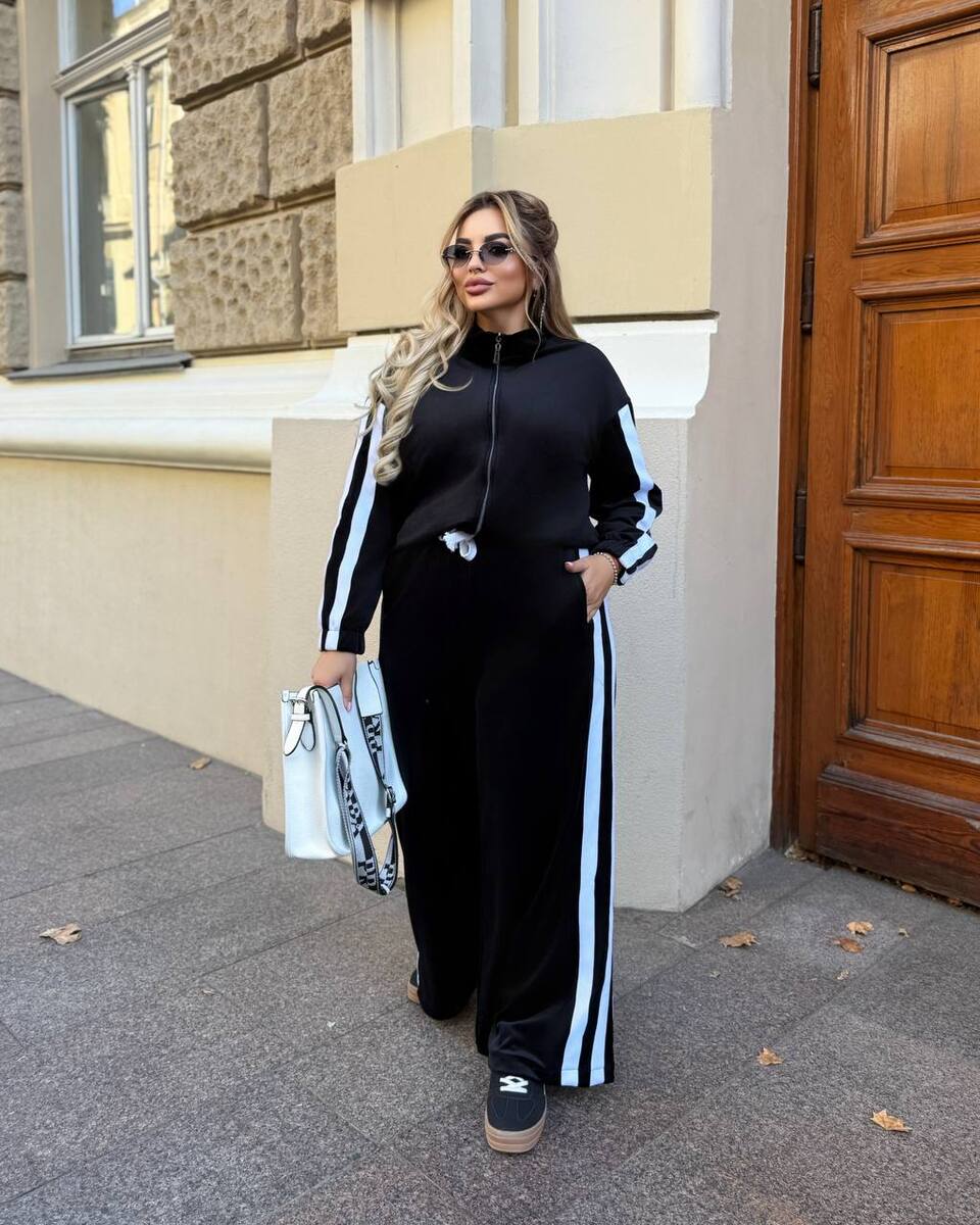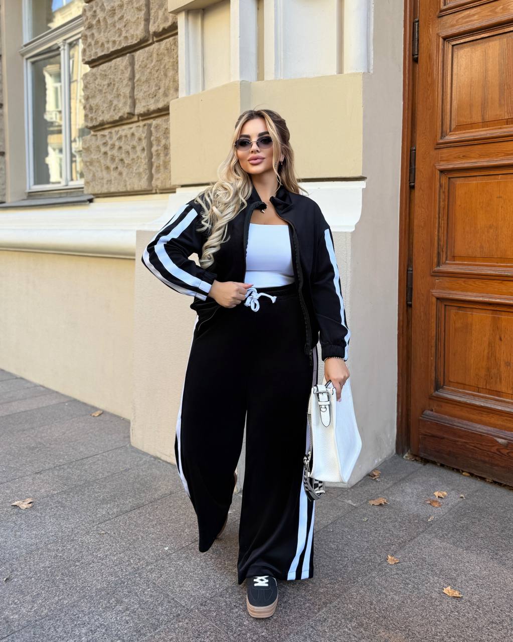 Кофта на блискавці, штанці палаццо висока посадка, пояс на резинці з робочим шнурком в поясі. Лампаси м,які х/б, тканину не стягують, дуже зручний, практичний костюм.