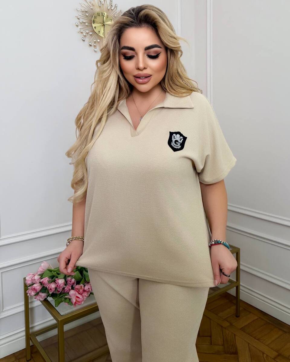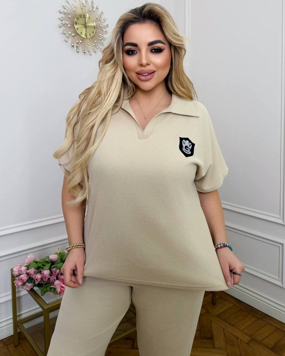 стильний та комфортний костюм з трикотажу еластан: футболка поло у стилі оверсайз з Акс + штани з високою посадкою на еластичній гумці, з кишенями в бічних швах, низ штанів на гумці.