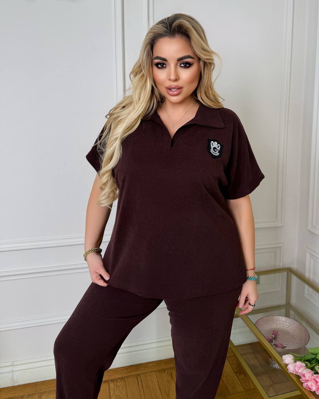 стильний та комфортний костюм з трикотажу еластан: футболка поло у стилі оверсайз з Акс + штани з високою посадкою на еластичній гумці, з кишенями в бічних швах, низ штанів на гумці.