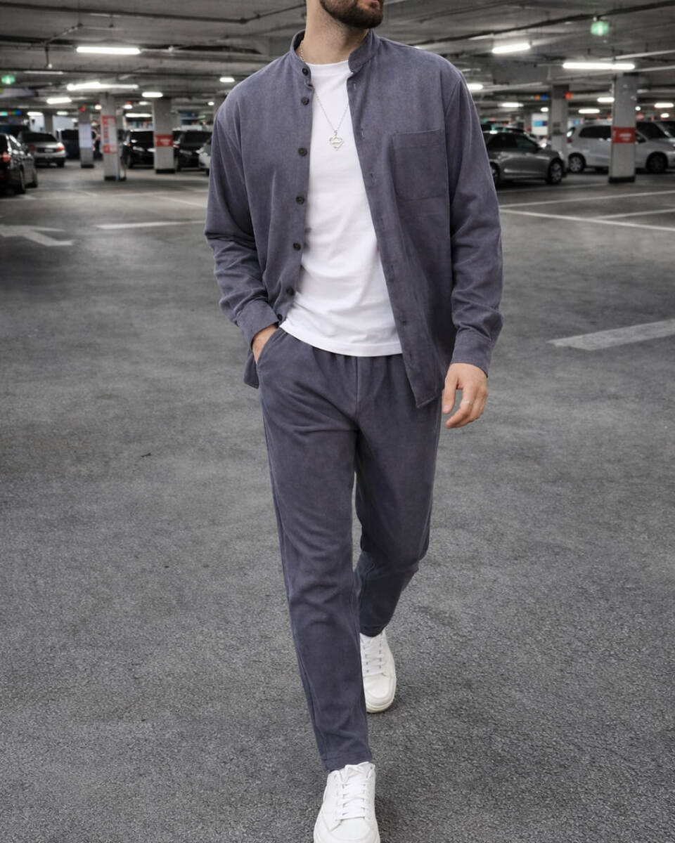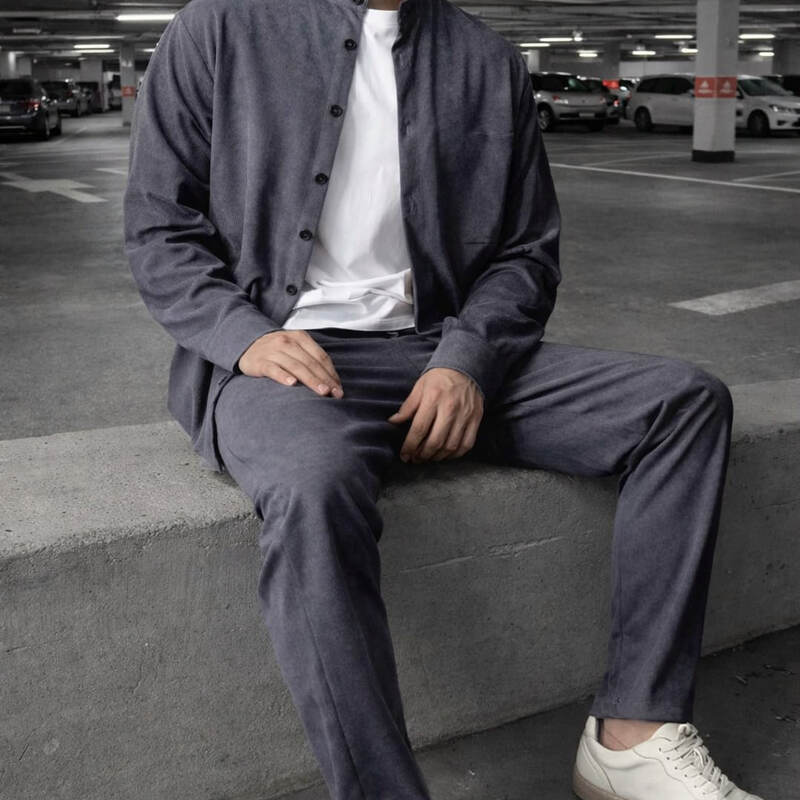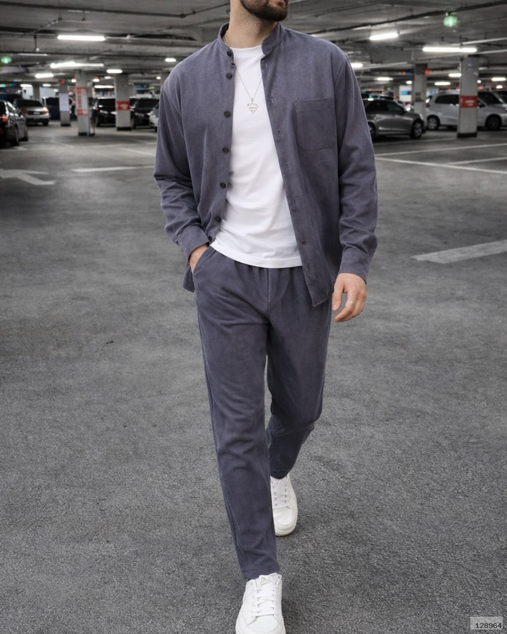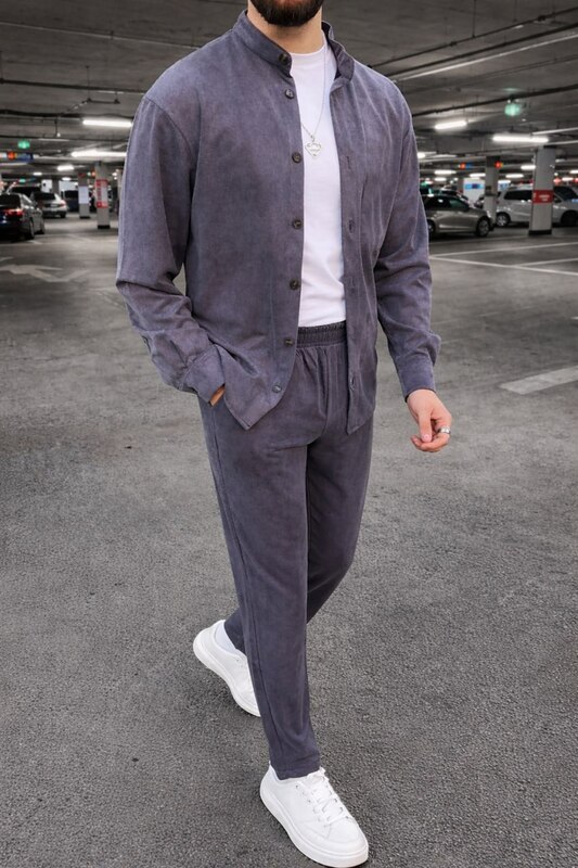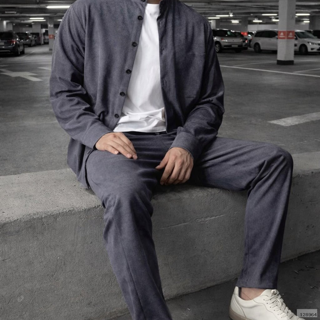 Модель виконана з вельвету: тканина щільна, приємна на дотик і виглядає дорого, при цьому не тягнеться. Сорочка прямого крою на ґудзиках із коміром-стійкою додає образу елегантності, а штани вільного силуету забезпечують зручність у щоденному носінні.