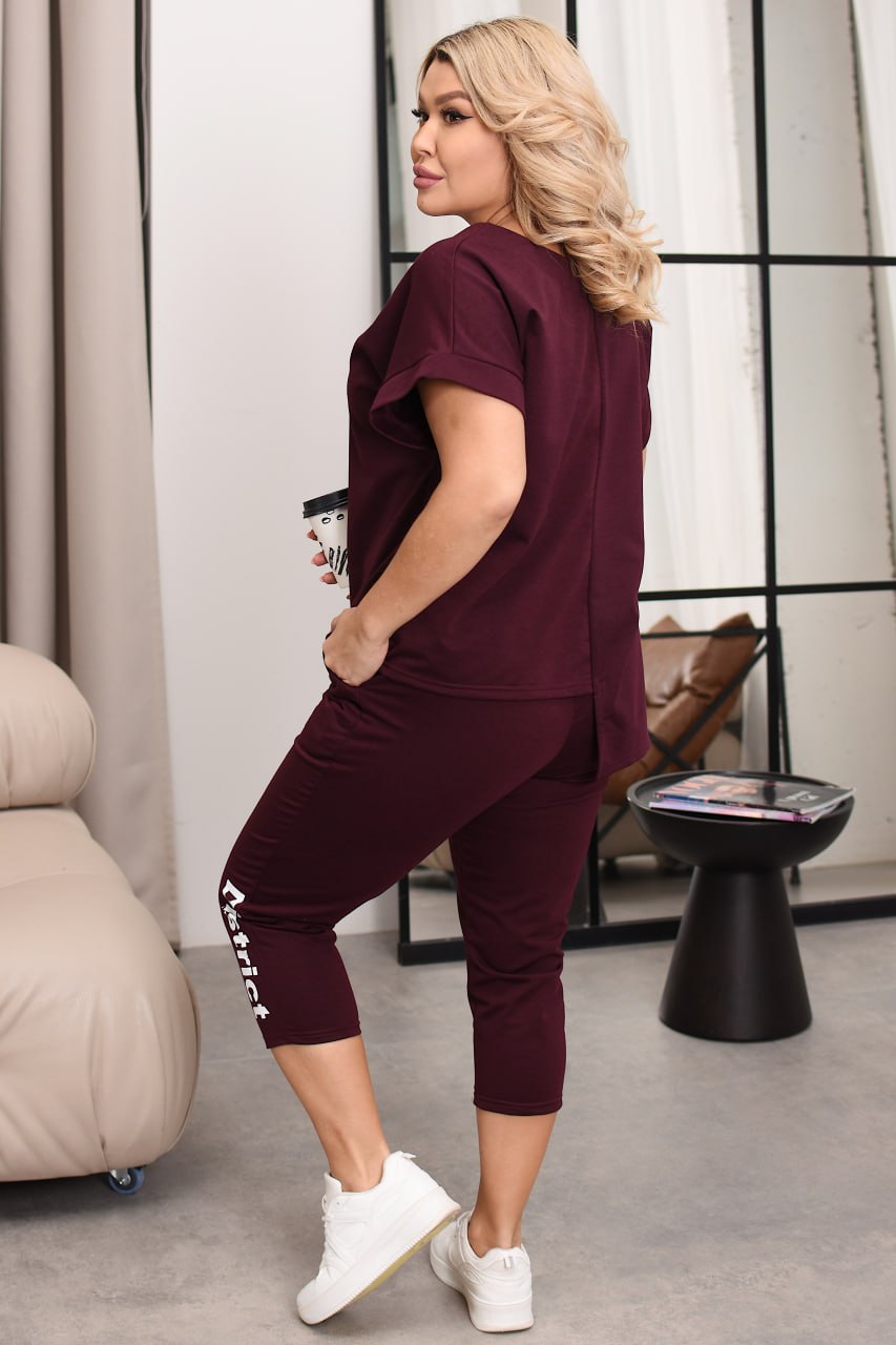 Легкий літній костюм двійка, який точно стане фаворитом вашого гардеробу! Асиметрична футболка з оригінальним написом додає образу динаміки, а бриджі — зручності.
