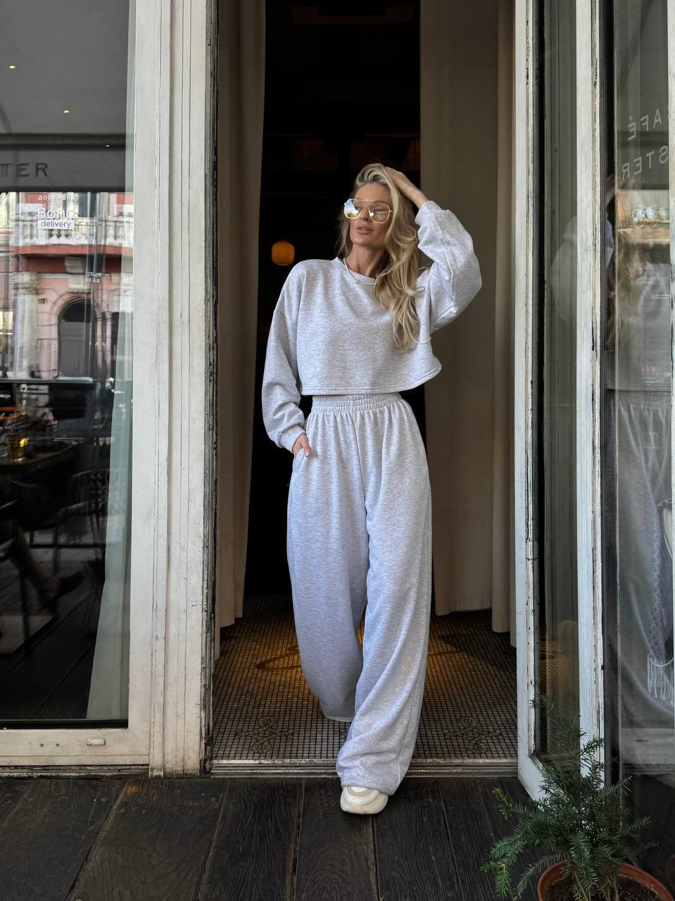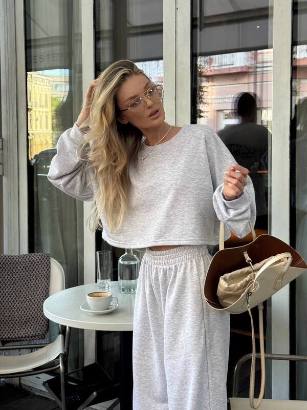 Кроп-світшот із спущеним плечем та широкі штани на резинці — ідеальний дует для прогулянки містом, кави з подругою чи просто chill-дня вдома. Виглядай модно, навіть коли максимально розслаблена