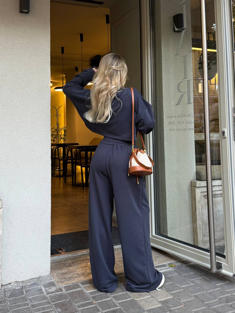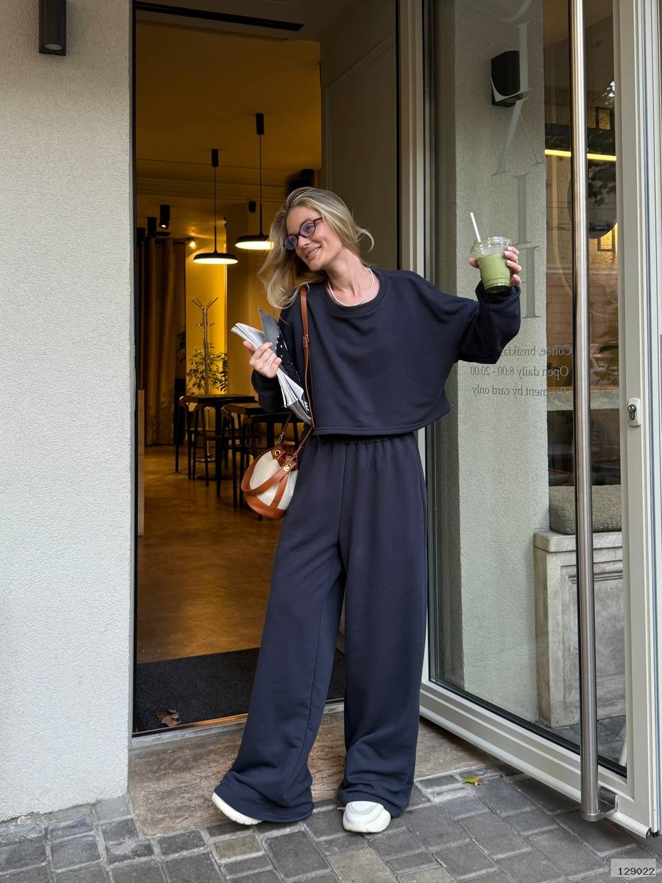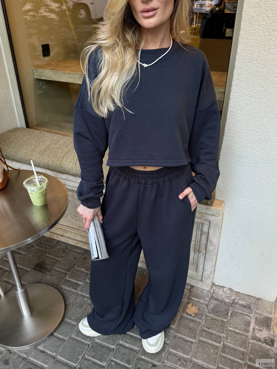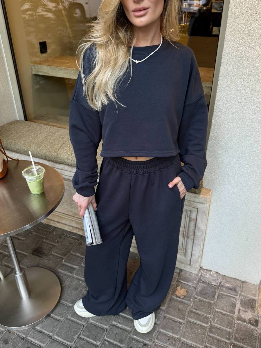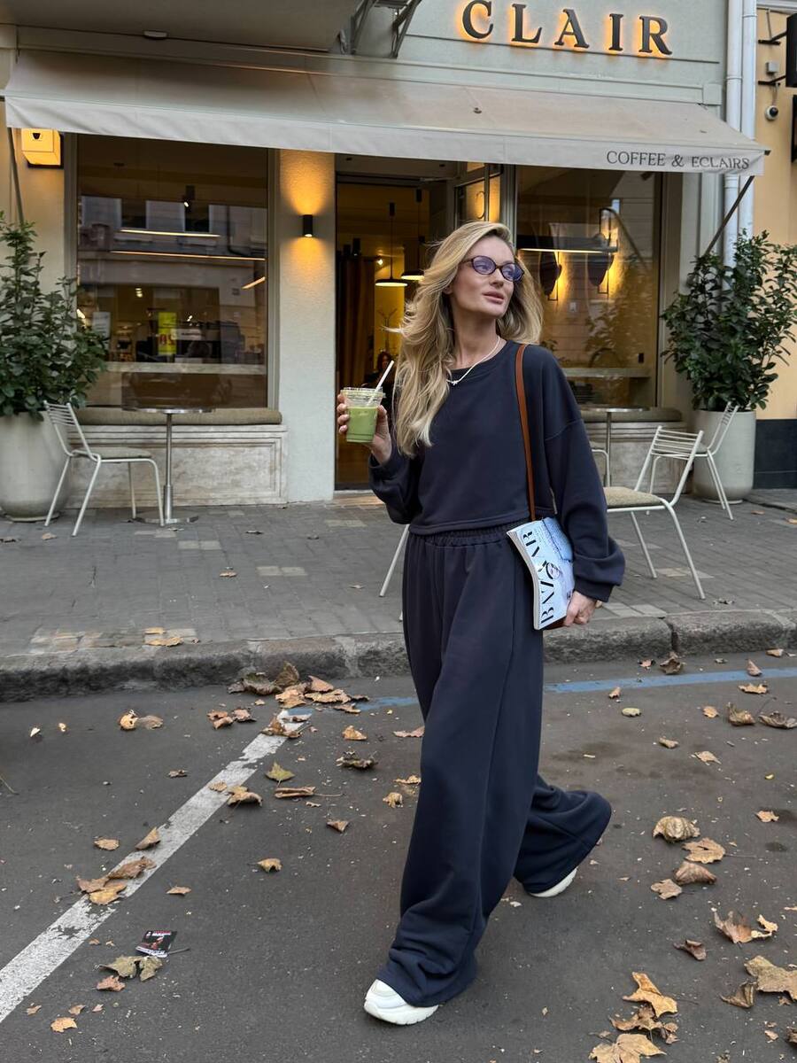Кроп-світшот із спущеним плечем та широкі штани на резинці — ідеальний дует для прогулянки містом, кави з подругою чи просто chill-дня вдома. Виглядай модно, навіть коли максимально розслаблена