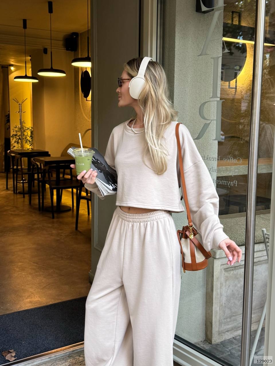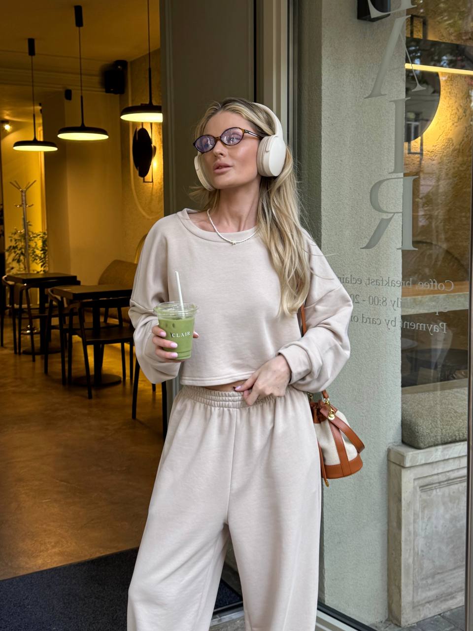 Кроп-світшот із спущеним плечем та широкі штани на резинці — ідеальний дует для прогулянки містом, кави з подругою чи просто chill-дня вдома. Виглядай модно, навіть коли максимально розслаблена
