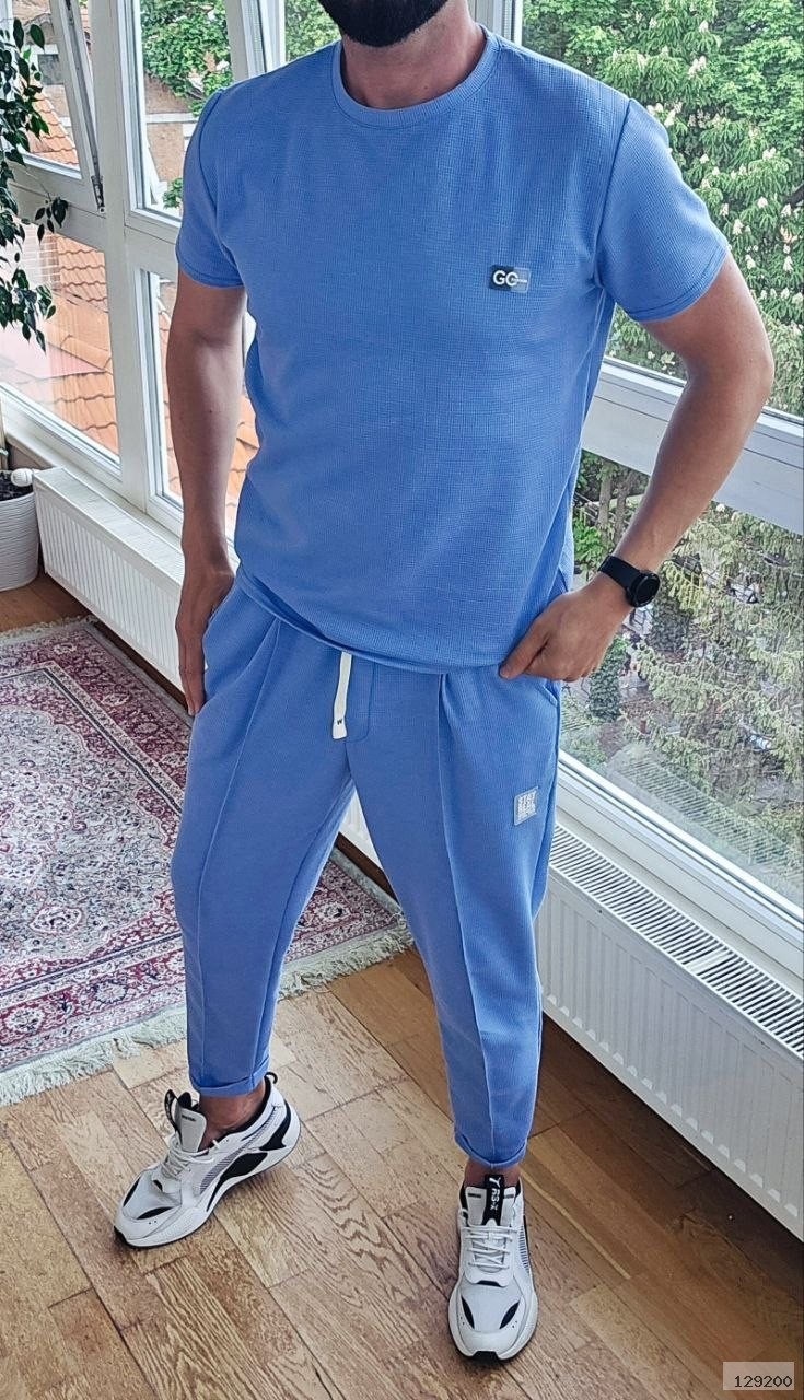 Футболка з фактурною текстурою,декорована силіконовою нашивкою на груднях.Штани з еластичним поясом,шнурком,бічними кишенями та силіконовою нашивкою.