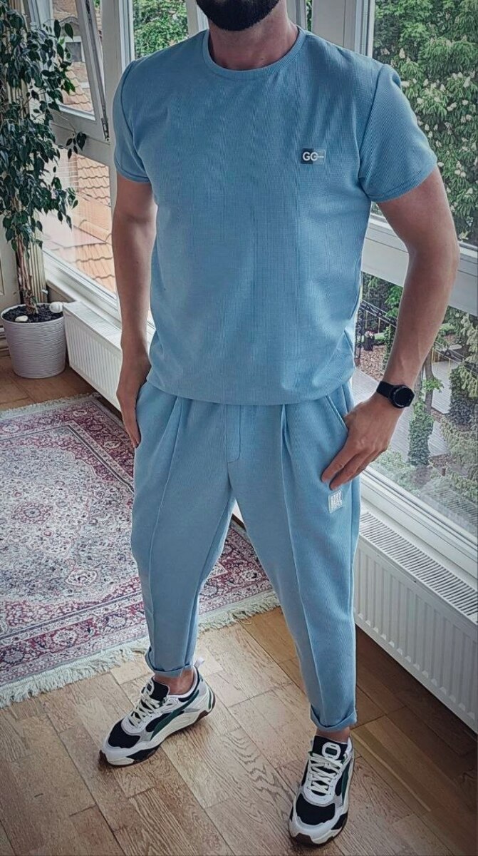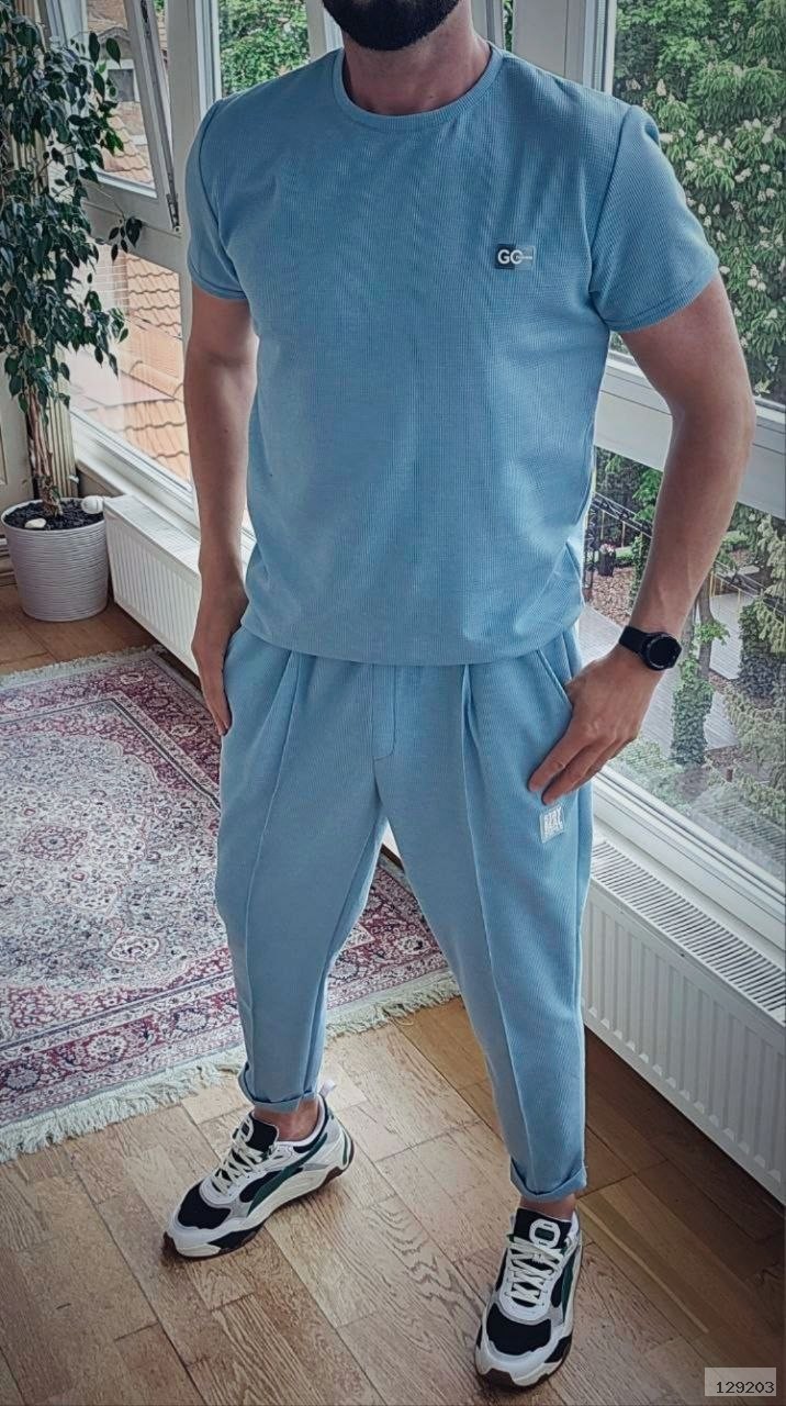 Футболка з фактурною текстурою,декорована силіконовою нашивкою на груднях.Штани з еластичним поясом,шнурком,бічними кишенями та силіконовою нашивкою.