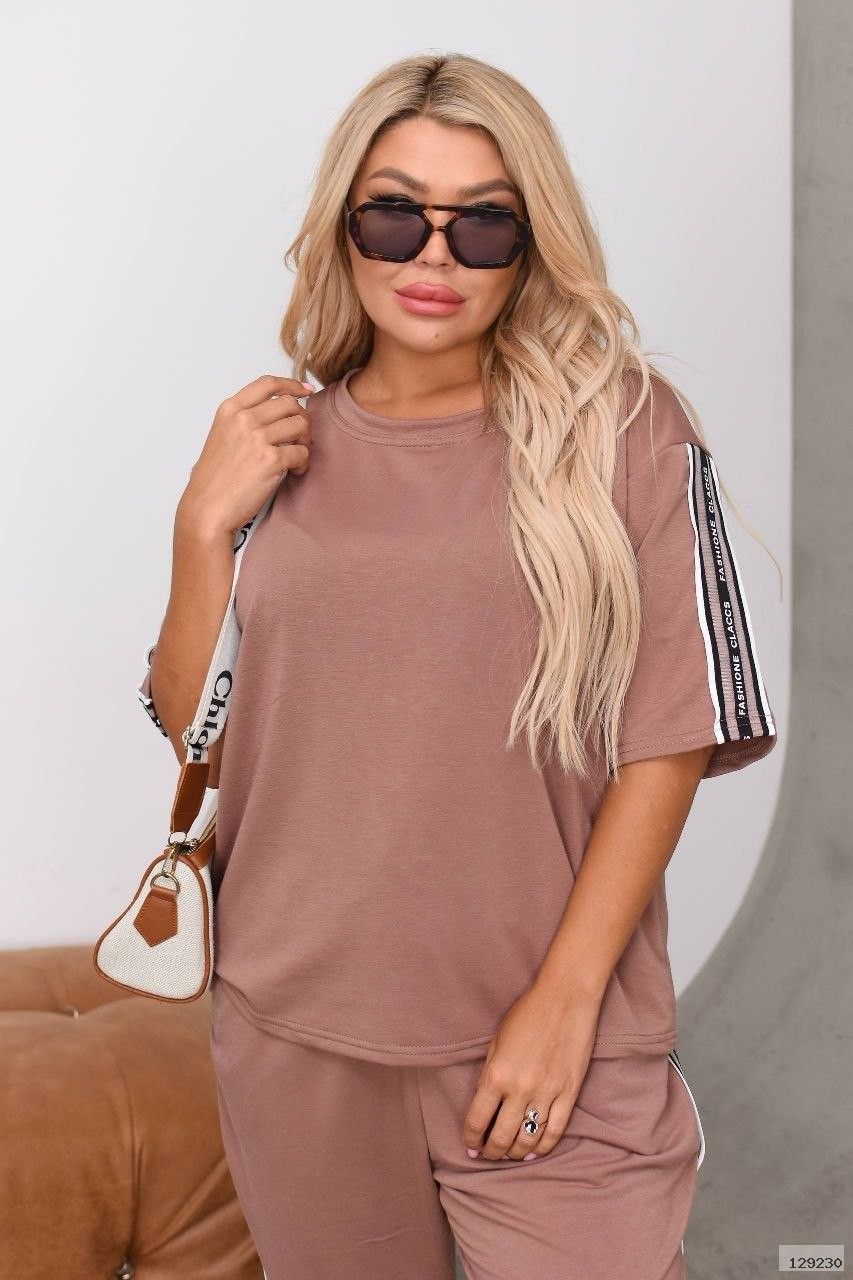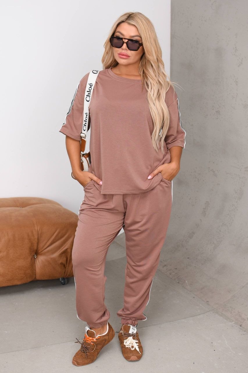 Весняно-літній костюм, футболка + штани, футболка з коротким рукавом і лампасами по рукавах. Штани джогери з кишенями на гумці, в поясі є шнурок, внизу манжета, лампаси з боків.