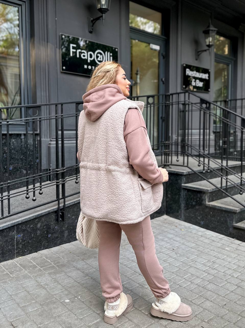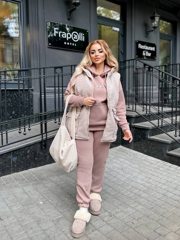 Стильний, комфортний і теплий костюм трійка. Джоггери+худі+жилетка. На поясі желетки куліска із затискачем.