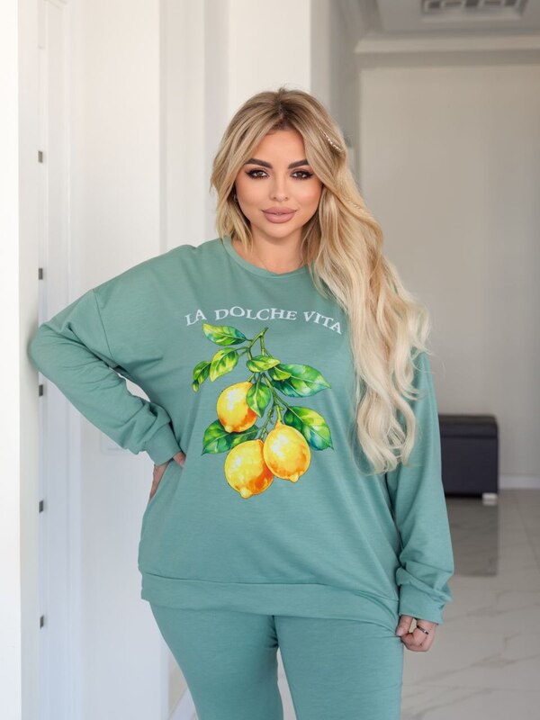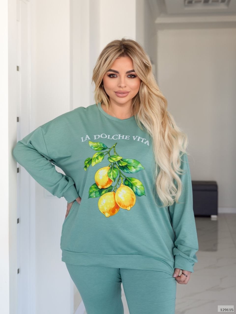 Стильний, комфортний костюм в трендових кольорах, виготовлений з двунитки гарної розтяжності. Подовжений світшот вільного крою з ефектним лимонним принтом, штани-лосини 7/8, висока посадка, кругова резинка. Ідеальний варіант на кожен день з кедами та кросівками.