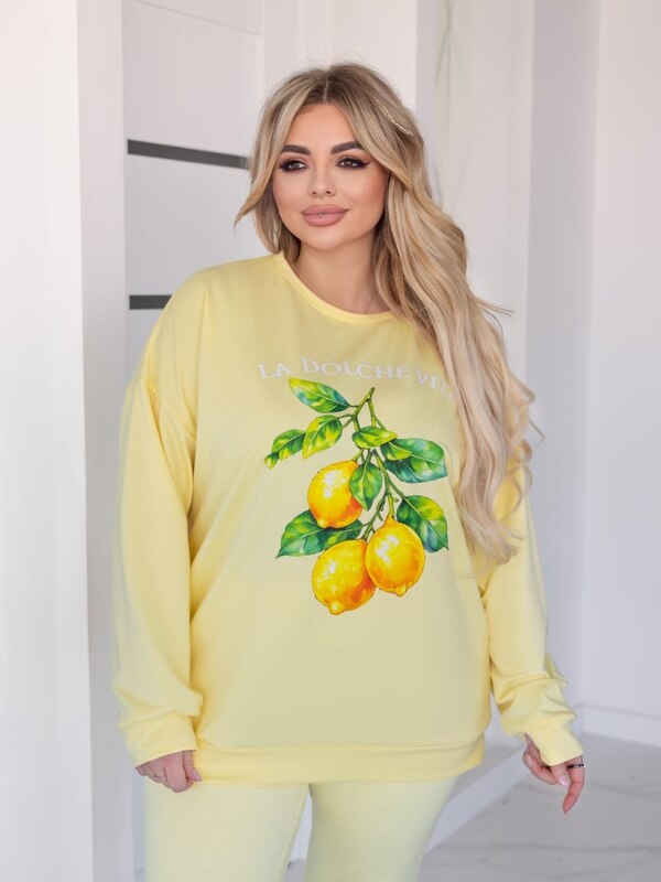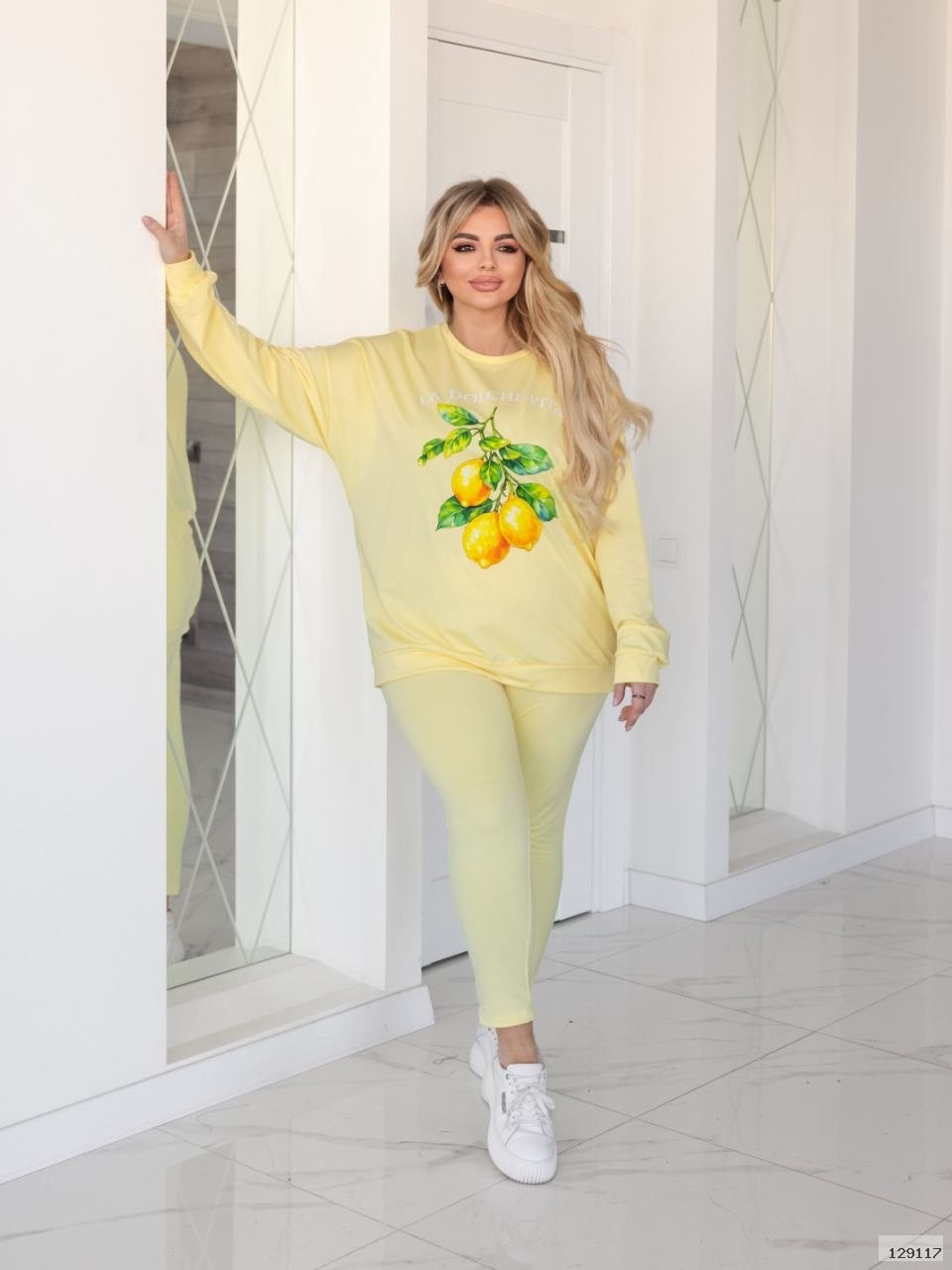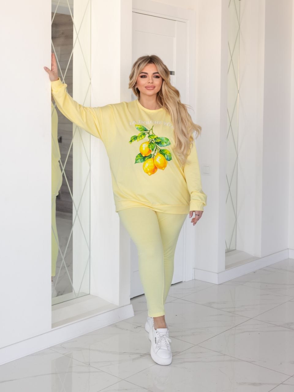 Стильний, комфортний костюм в трендових кольорах, виготовлений з двунитки гарної розтяжності. Подовжений світшот вільного крою з ефектним лимонним принтом, штани-лосини 7/8, висока посадка, кругова резинка. Ідеальний варіант на кожен день з кедами та кросівками.