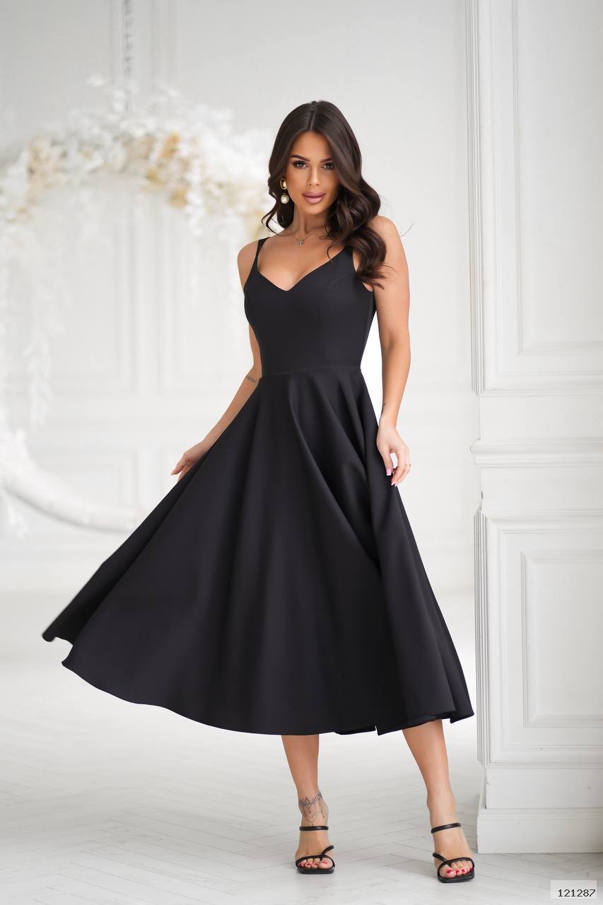 Ефектна коктейльна сукня приталеного силуету, спідниця повне сонце, спину підкреслюють подвійні бретелі, довжина міді