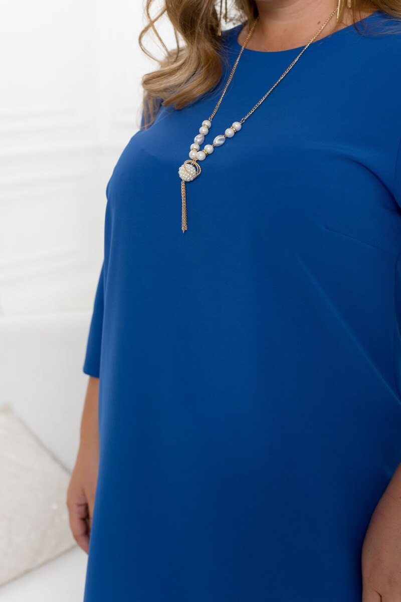 Елегантна та мінімалістична сукня з напівкруглим широким вирізом горловини. Рукав вільний без манжета довжиною 3/4. Застібок немає. На грудях діагональні виточки. Прикраса входить в комплект.