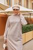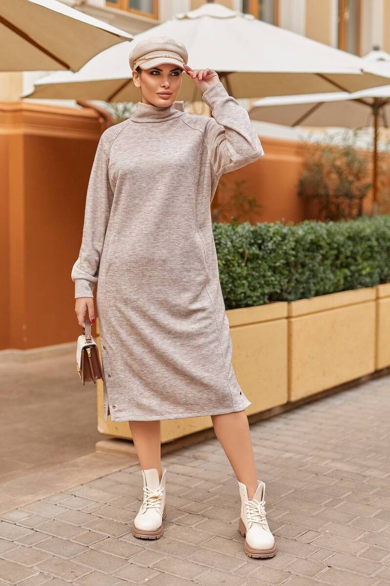 Сукня вільного крою, на грудях- прикраса зі страз, рукав реглан, з кишенями, знизу з розрізами на кнопках.