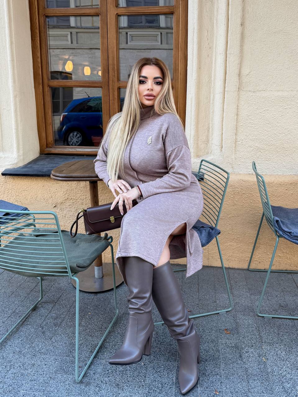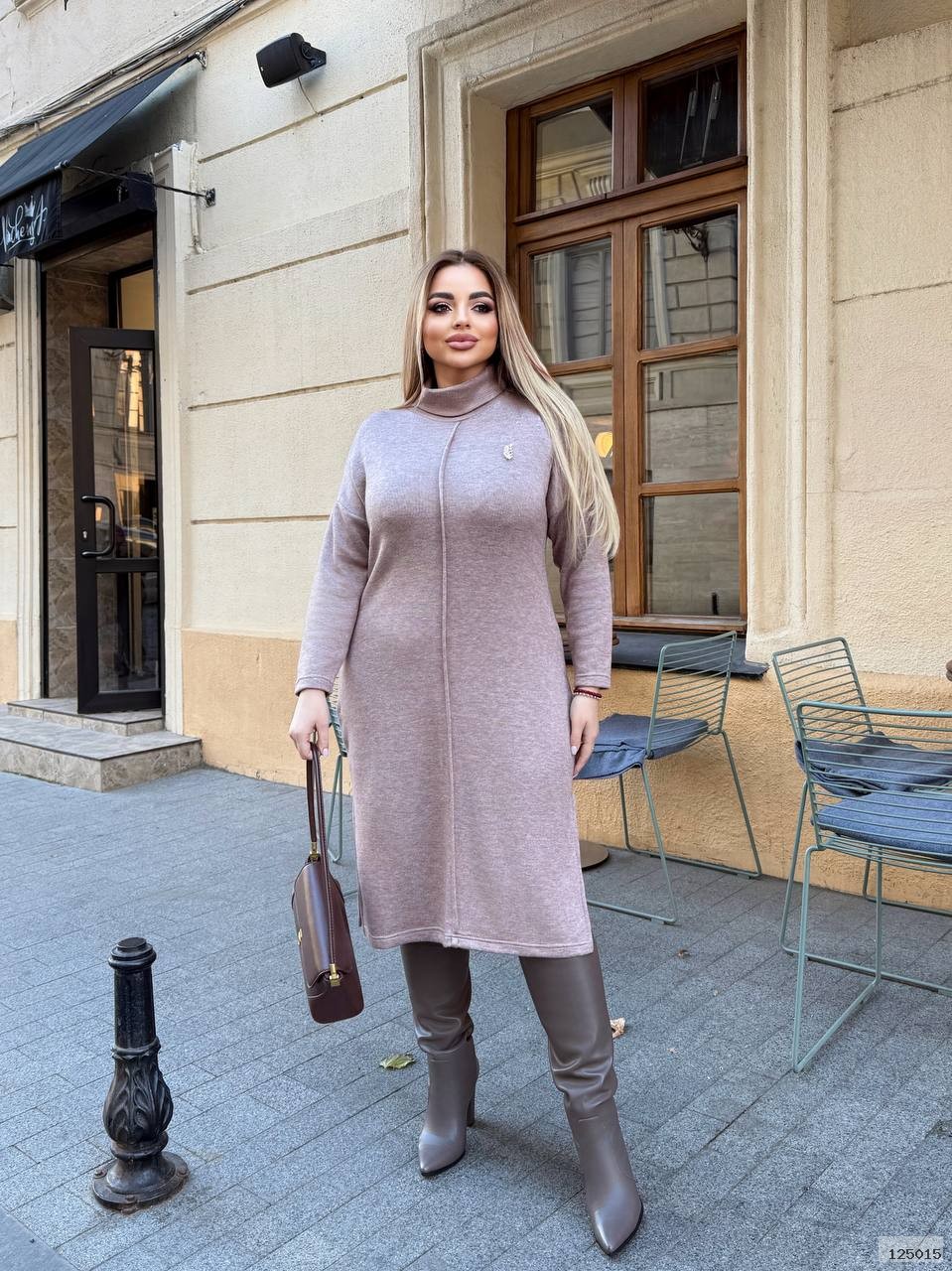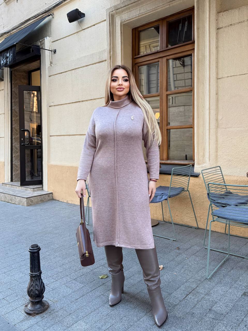 Сукня з довгим спущеним рукавом, ворот-стійка; плаття прикрашене декоративним швом по центру виробу, з боків розрізи. Брошка у подарунок