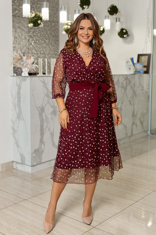 Елегантне жіноче плаття, виконане з кріп дайвінгу (тягнеться) і сітки з блиском. Перед сукні з імітацією запаху. До сукні додається знімний пояс із основної тканини. У такій сукні будь-яка жінка зможе відчути себе справжньої леді та королевою вечора, ця сукня здатна надати жінці ніжності, легкості та елегантності.