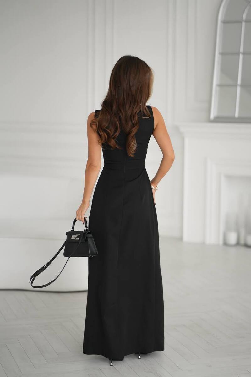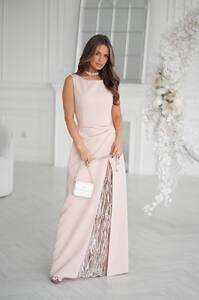 Має прямий силует, витончену драпіровку на талії та високий розріз, що додає образу жіночності й шарму.
