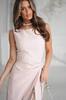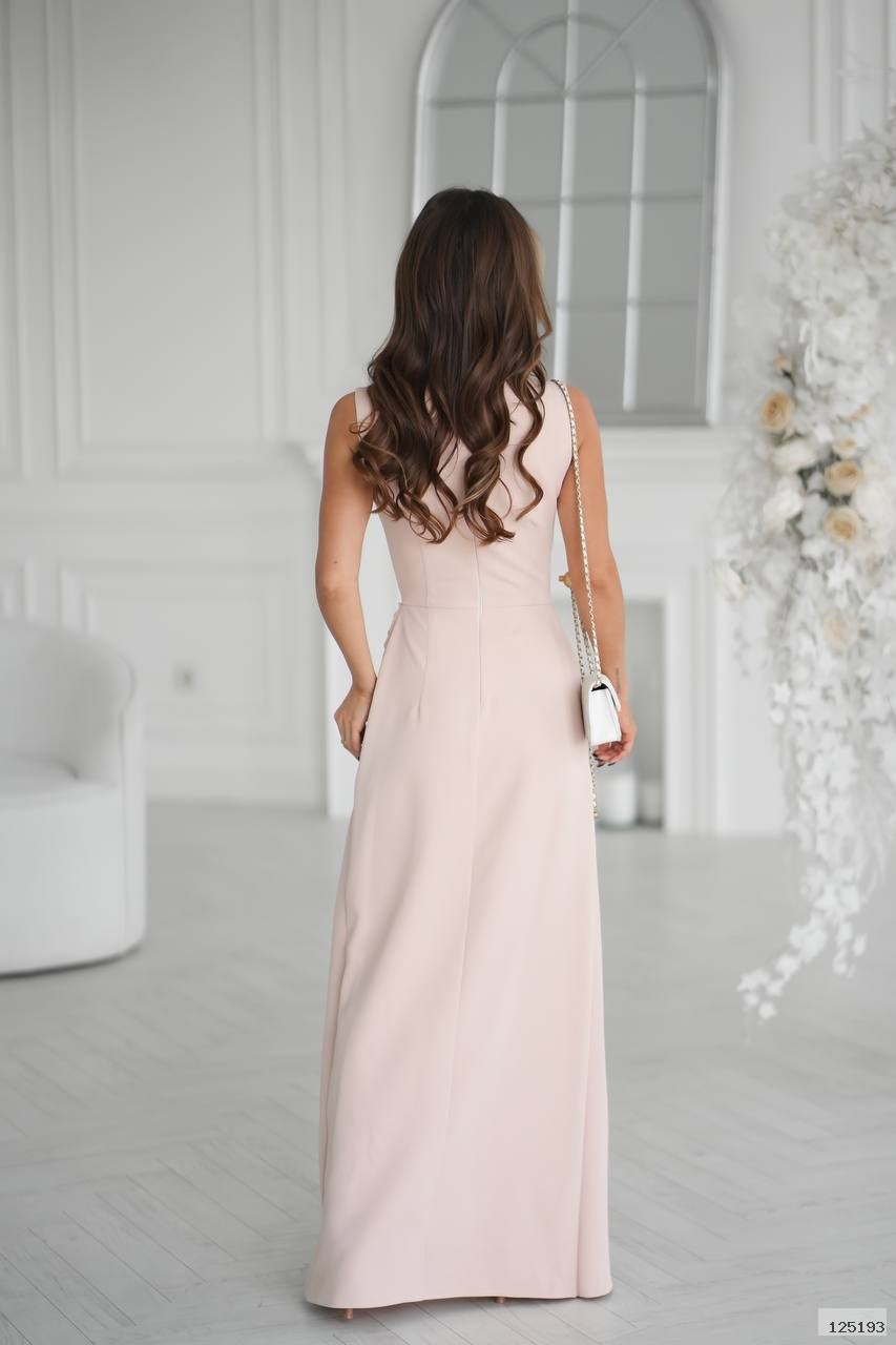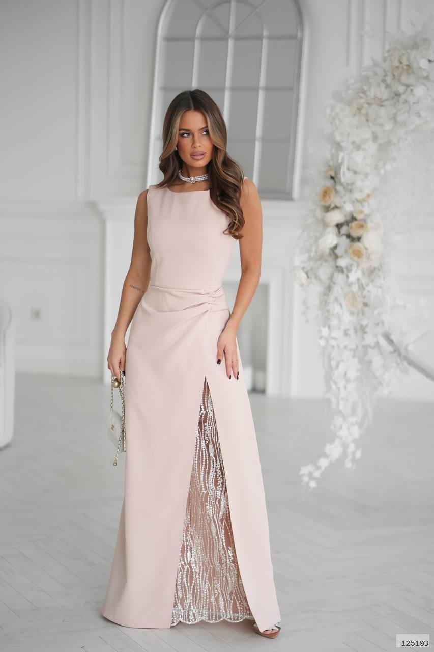 Має прямий силует, витончену драпіровку на талії та високий розріз, що додає образу жіночності й шарму.