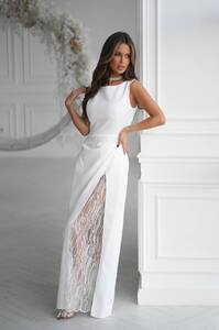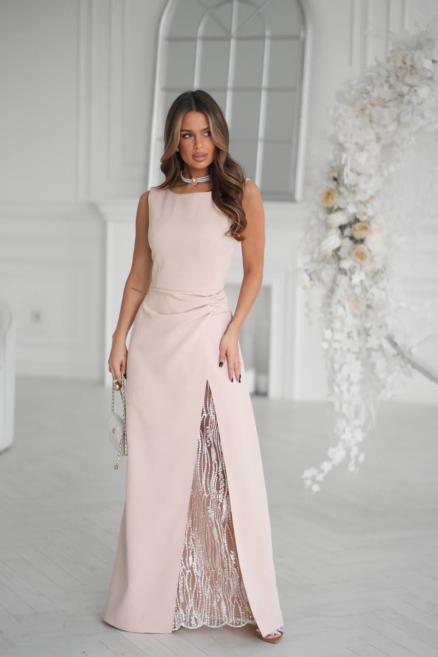 Елегантна сукня з гладкої костюмної тканини з розкішною мереживною вставкою, прикрашеною глітером.