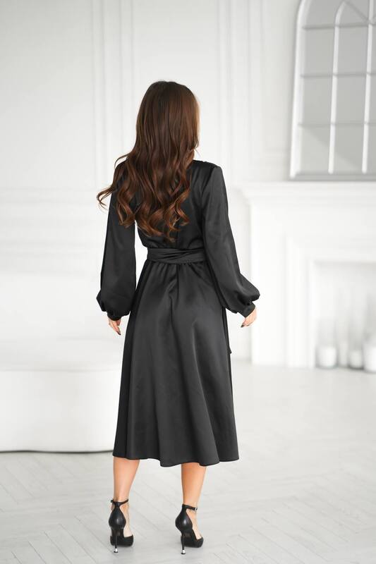 Довгі рукави з манжетами надають образу ніжності, а струмлива тканина красиво грає на світлі, створюючи ефект дорогоцінного шовку.