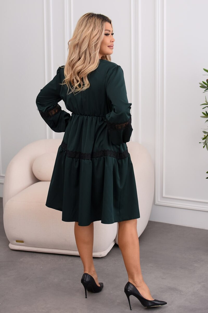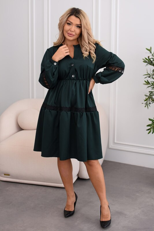 Сукня вільного крою з застібкою на ґудзики до талії. По лінії талії — м’яка резинка для комфортної посадки. Декор із мережива додає ніжності, сукня пасує до кросівок і чобіт, легко комбінується на щодень і на свято.