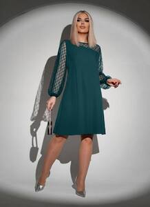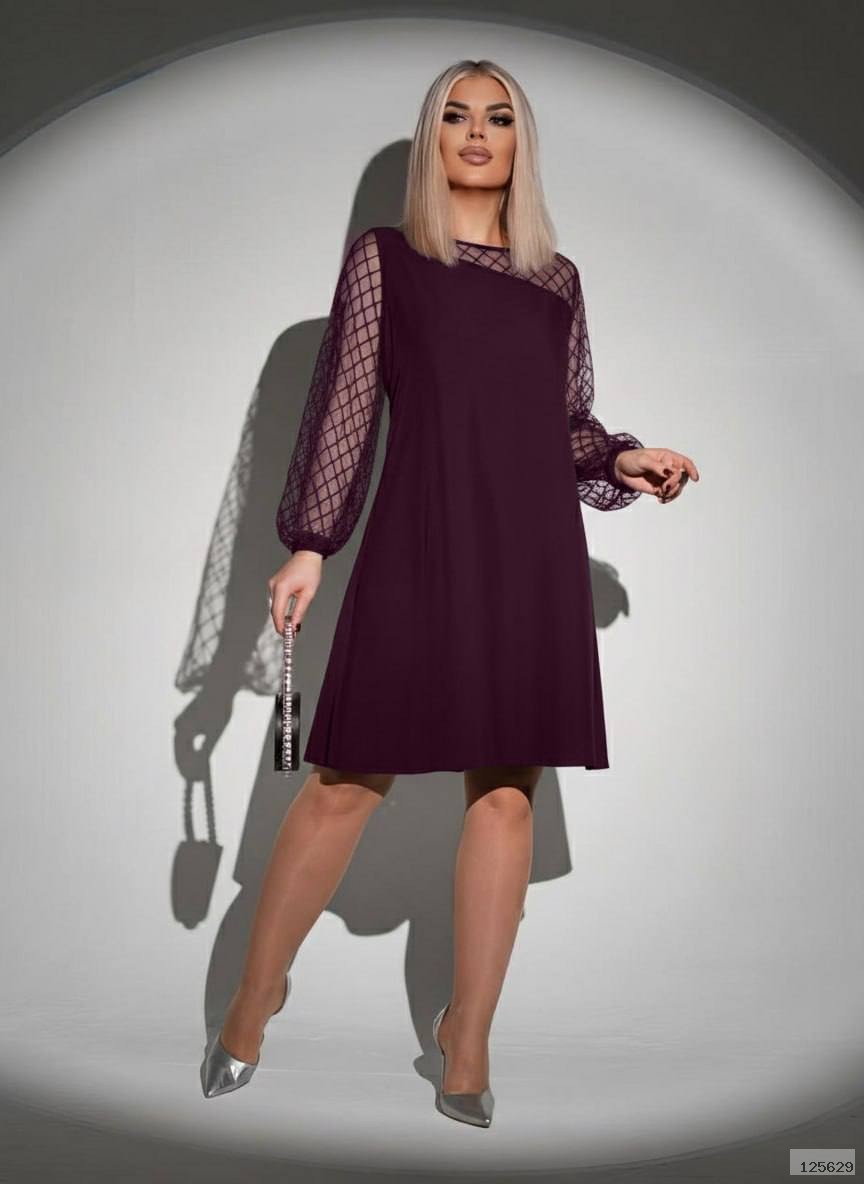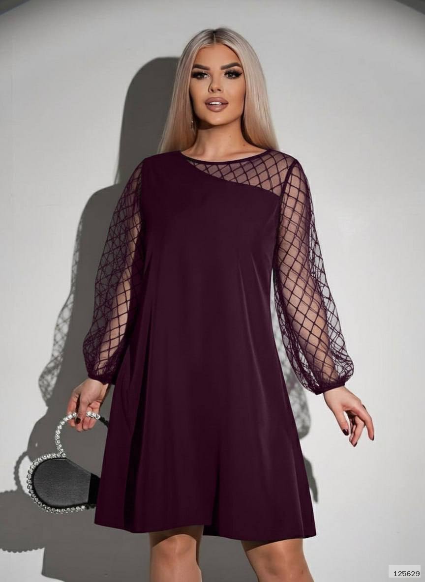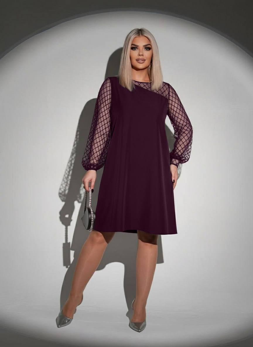 Елегантна сукня, яка має прямий вільний крій, що гарно сідає на будь-яку фігуру. Родзинка виробу — прозорі сітчасті вставки з малюнком у клітинку на рукавах та в зоні декольте, які додають образу вишуканості та ніжності.