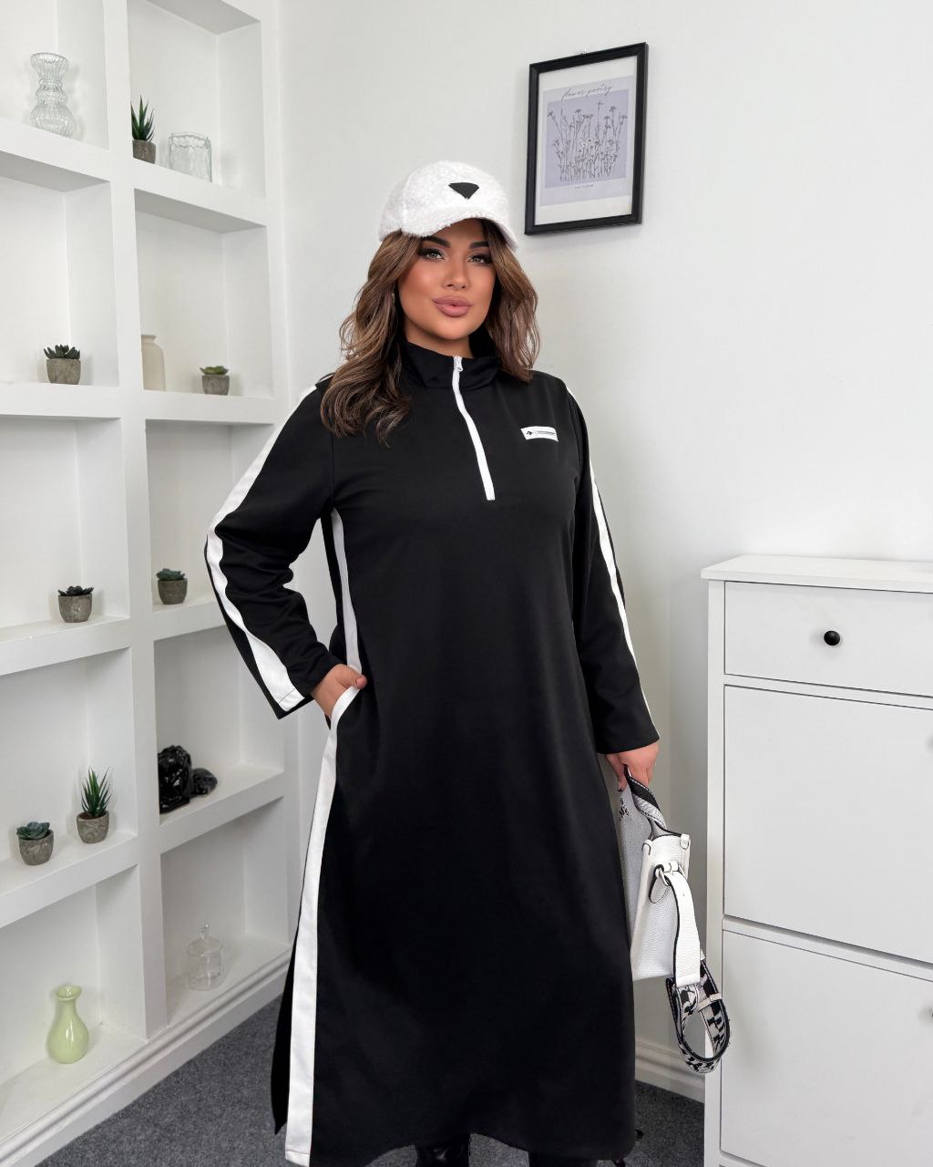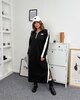 Контрастні вставки візуально витягують сілует, з боків розрізи. Робоча блискавка, декорована нашивкою. Ідеальний варіант, як на вихід, так і на кожен день.