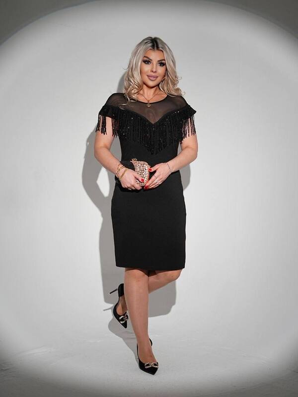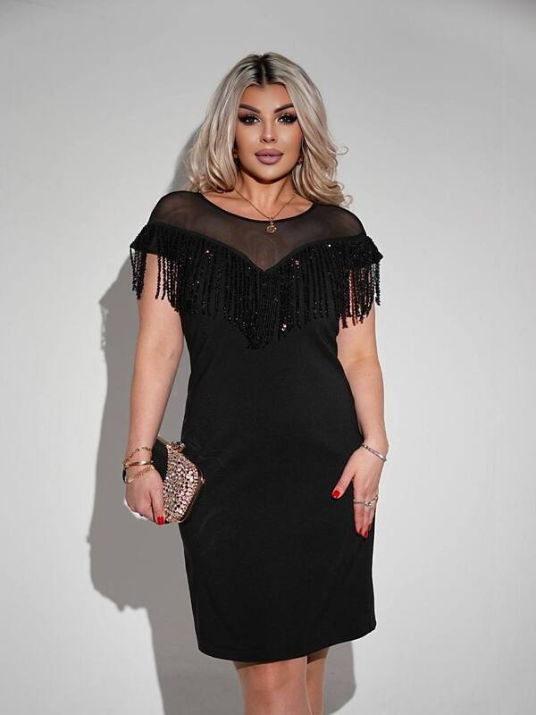 Витончена сукня, яка підкреслює силует. Сукня декорована елегантною бахромою з паєткою